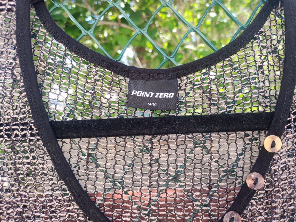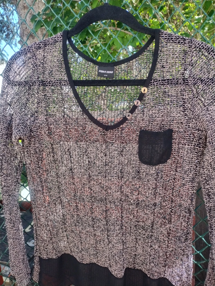 Selling a Point Zero top in size M and fits smaller. It features a unique knit design with 3 mother of pearl buttons and silk accents. Measures 17" armpit to armpit.