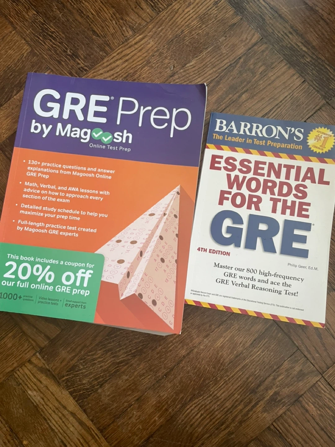 Selling two GRE prep books! One is 'GRE Prep by Magoosh' and the other is 'Barron's Essential Words for the GRE, 4th Edition'. Both are in good condition and ready to help you ace your GREs