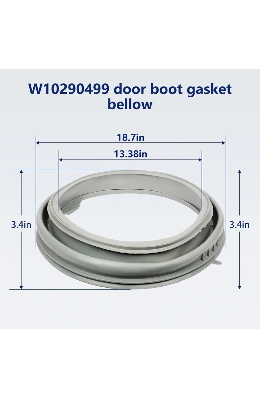 The gasket measures approximately 18.7 inches in outer diameter and 13.38 inches in inner diameter, with a thickness of 3.4 inches.