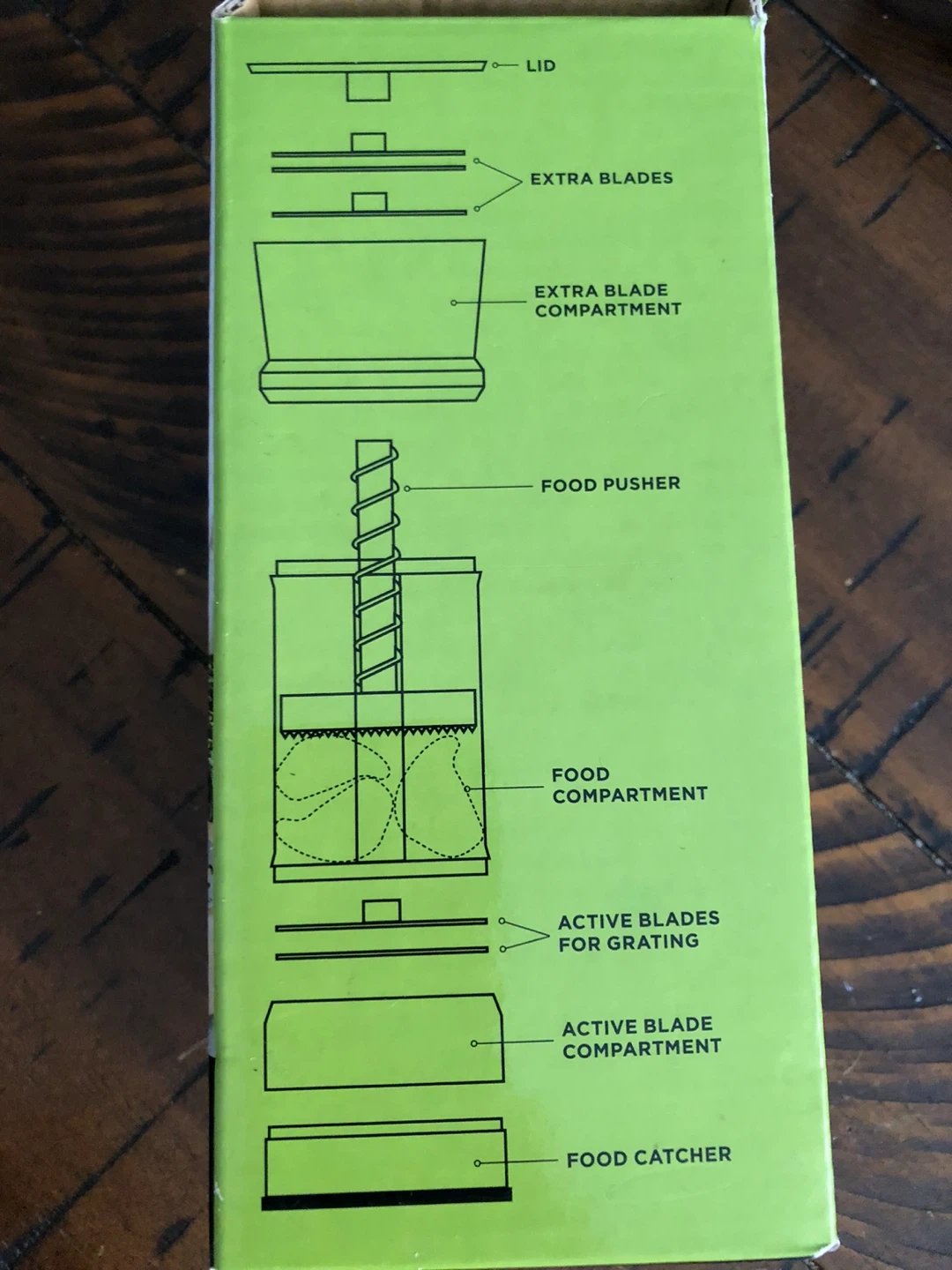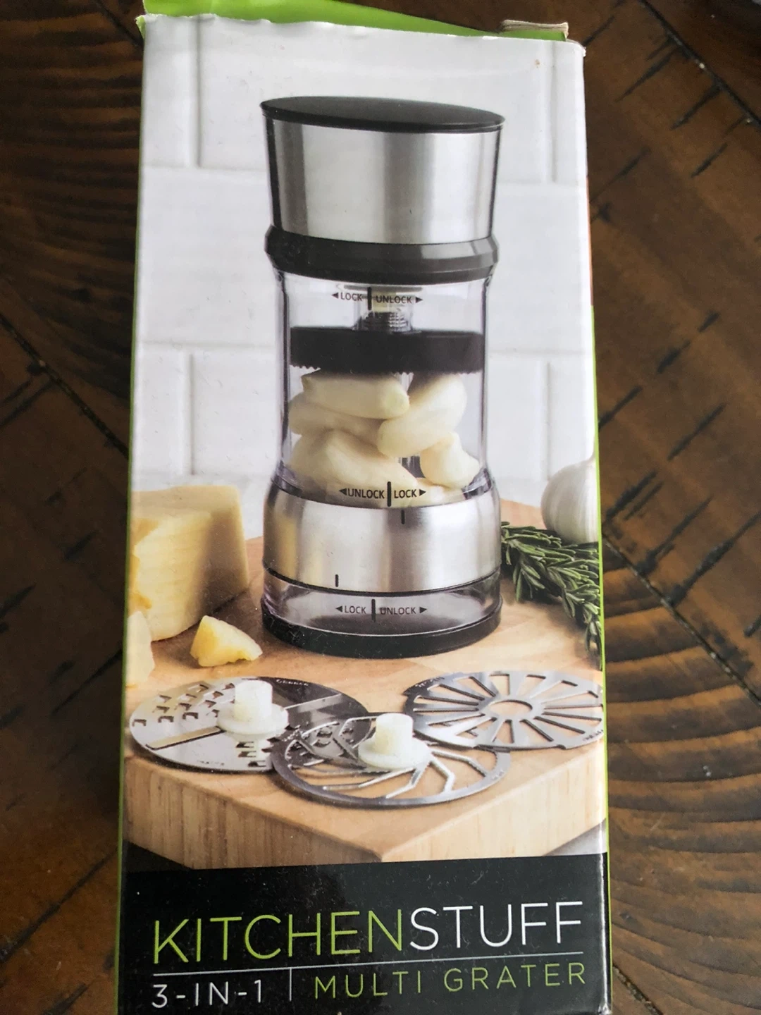 I'm selling a Kitchen Stuff 3-in-1 Multi Grater! It comes with multiple blades for grating cheese, shaving cheese, mincing garlic, and chopping herbs. It also includes extra blade compartments, a food pusher, a food compartment, active blades for grating, an active blade compartment, and a food catcher. New in box.
