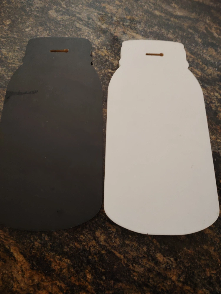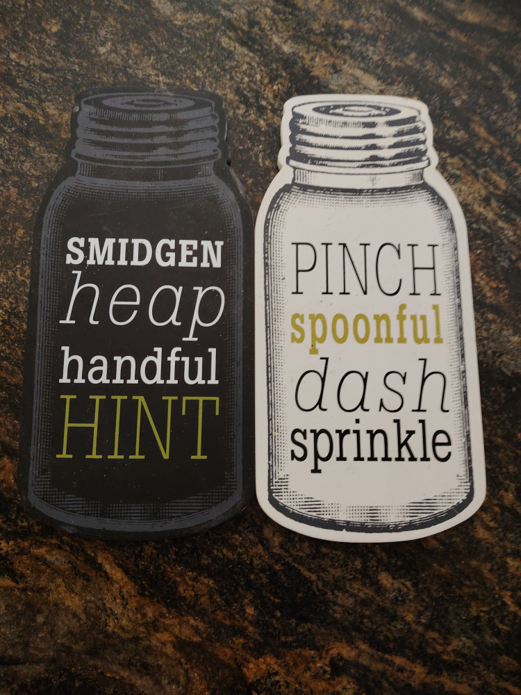 Spice up your kitchen or dining area with this cute set of mason jar-shaped decorative wall art! One is black with the words 'Smidgen, Heap, Handful, Hint' and the other is white with 'Pinch, Spoonful, Dash, Sprinkle' printed on it. Perfect for adding a touch of rustic charm to your home!