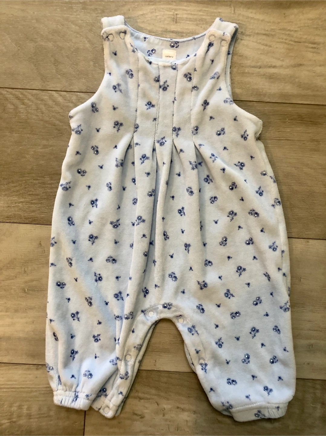 This adorable baby outfit from Carter's is perfect for your little one! It's size 6 months (12.5-16.5 lb, 5.7-7.5 kg) and made of 80% cotton and 20% polyester. The outfit is a light blue colour with a cute floral pattern.