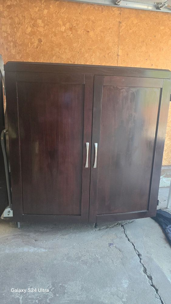 Selling a sturdy dark brown cabinet! It features two doors and two drawers, providing ample storage space. Perfect for organizing your belongings in any room of your home
