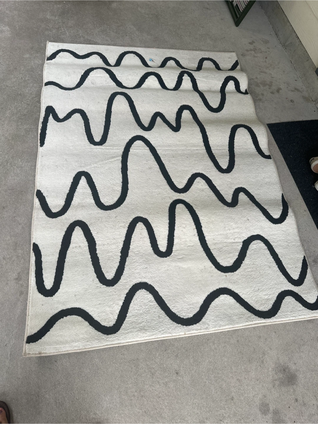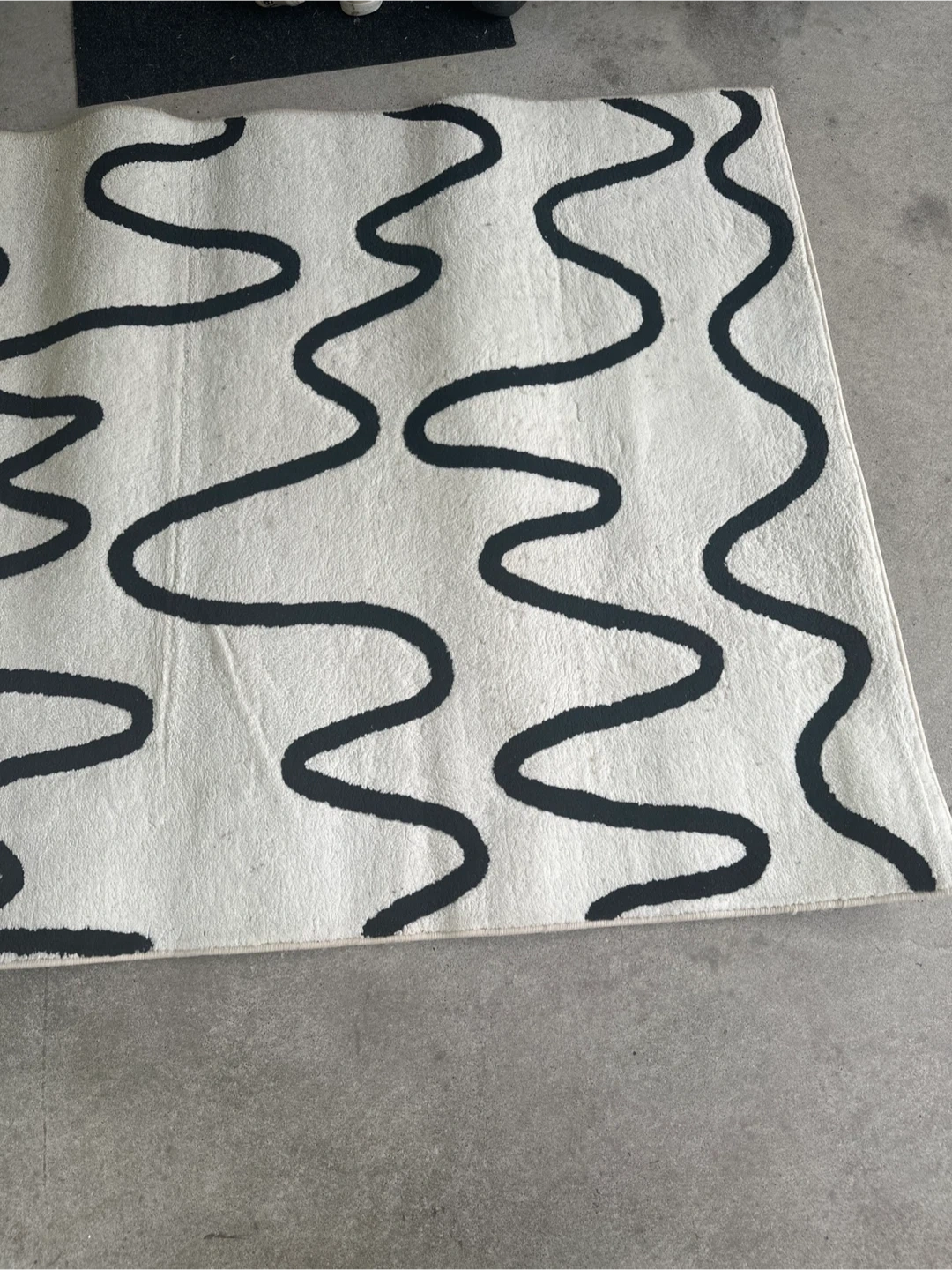 Selling a rug with a black and white wavy pattern. It's in great condition and would look great in any room of the house