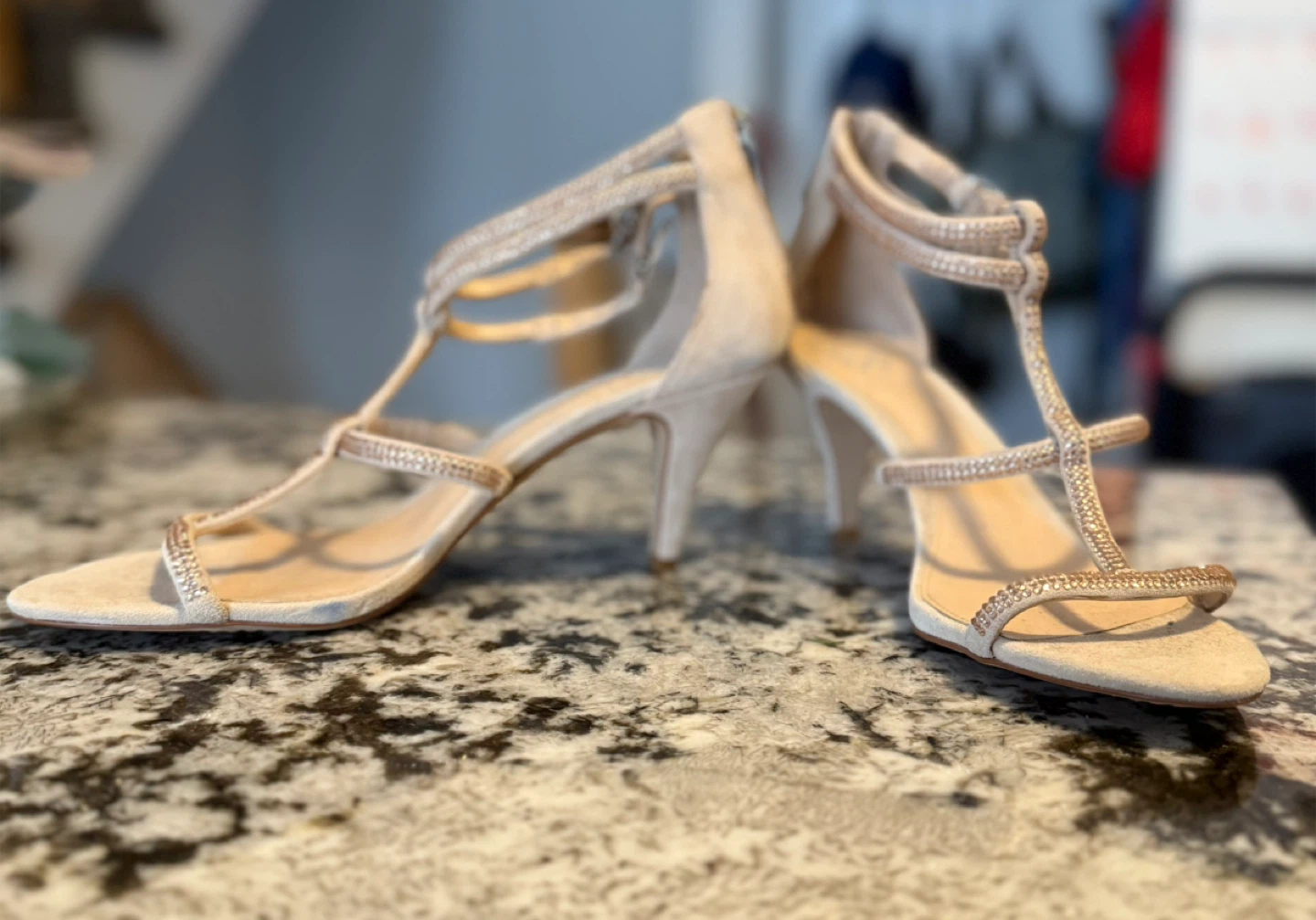 Size 7 Vince Camuto nude heels with sparkly straps. Never worn outside — bought for a wedding but ended up choosing a different pair. In like-new condition (just stored). Mid-height heel, very elegant and versatile.