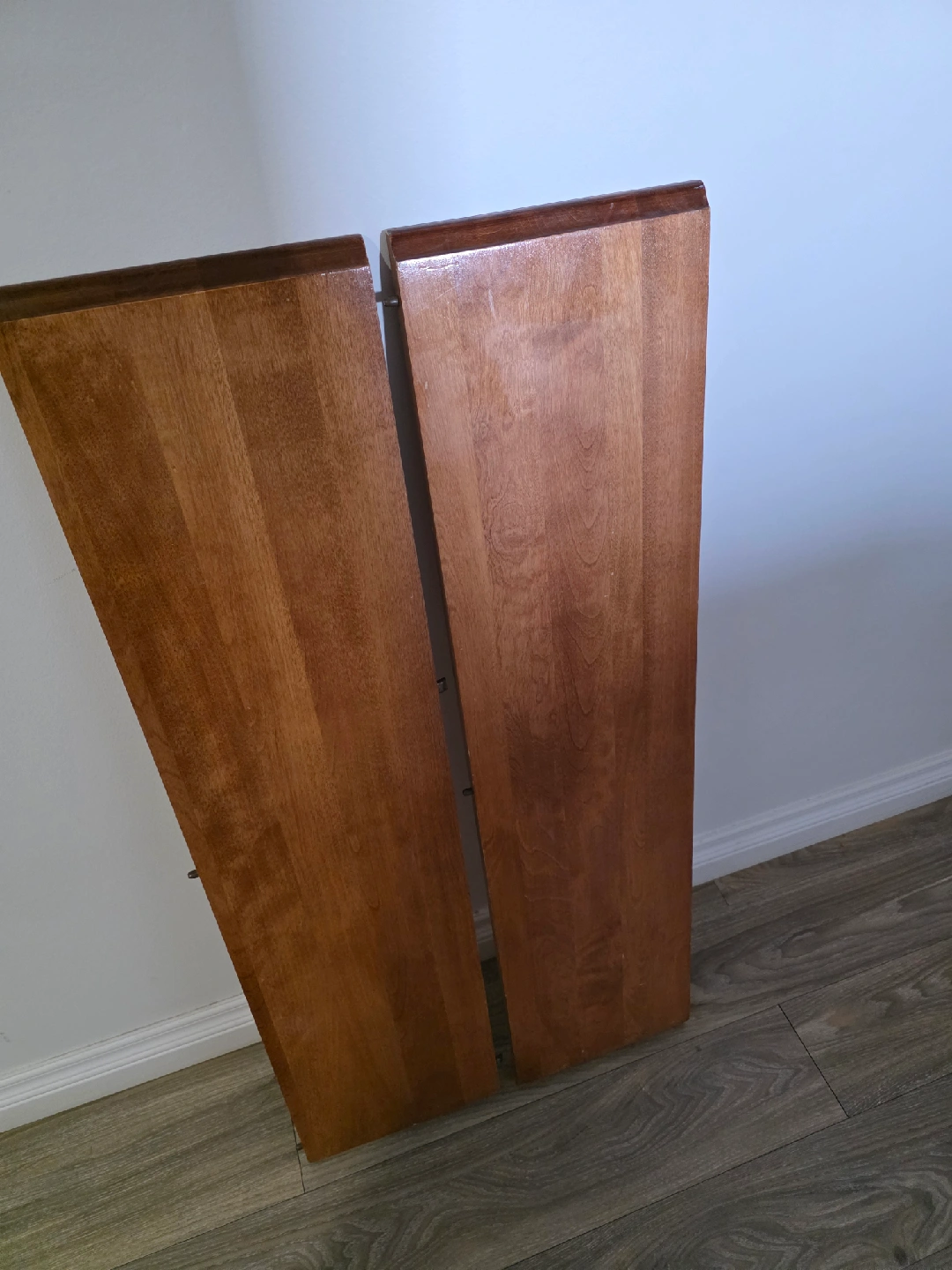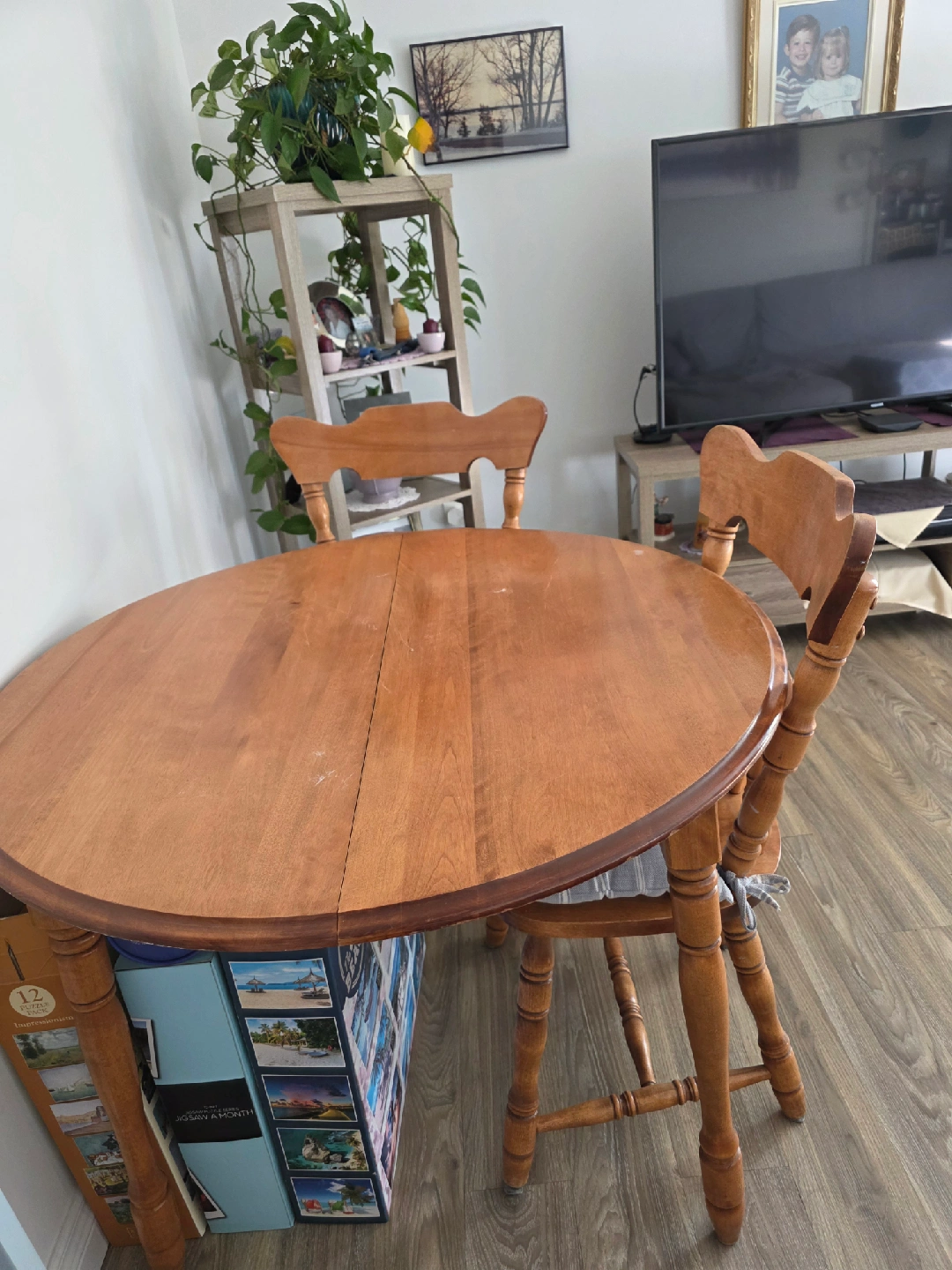 Selling a round wooden dining table that comes with four chairs and two leaves. It's in good condition and ready for a new home. Perfect for a small dining area or kitchen!