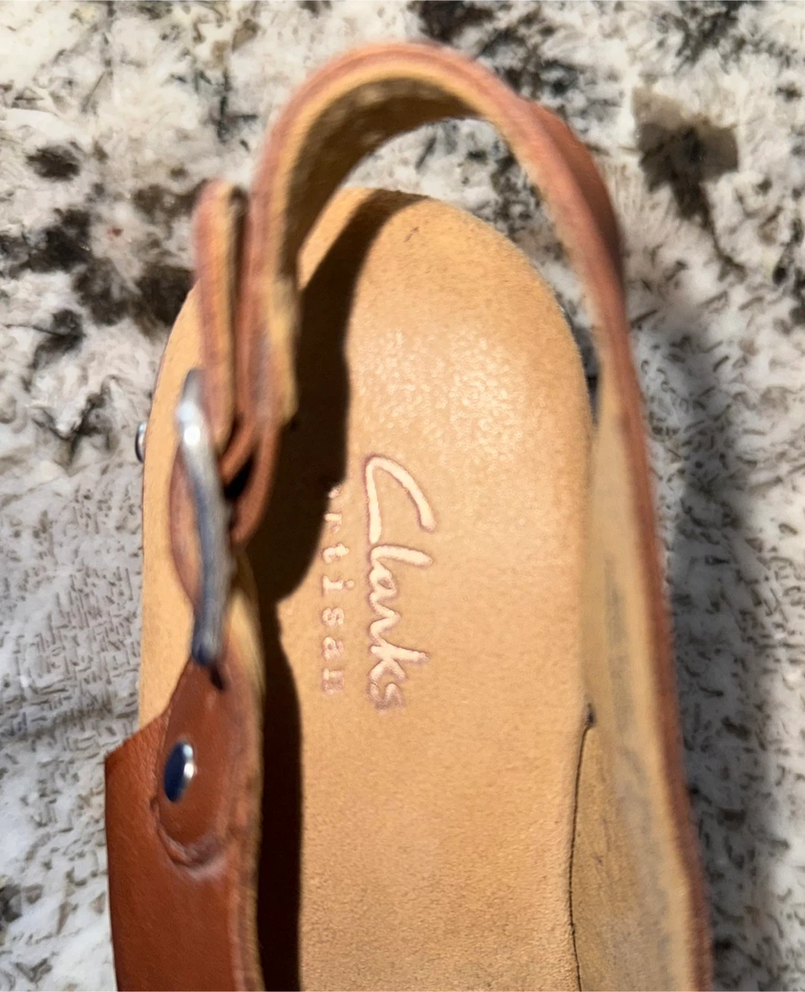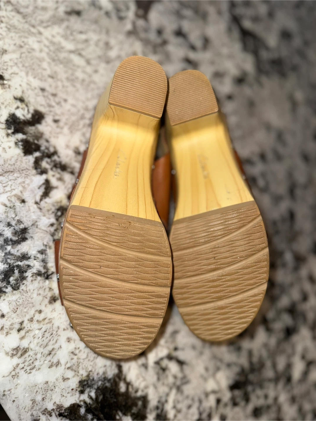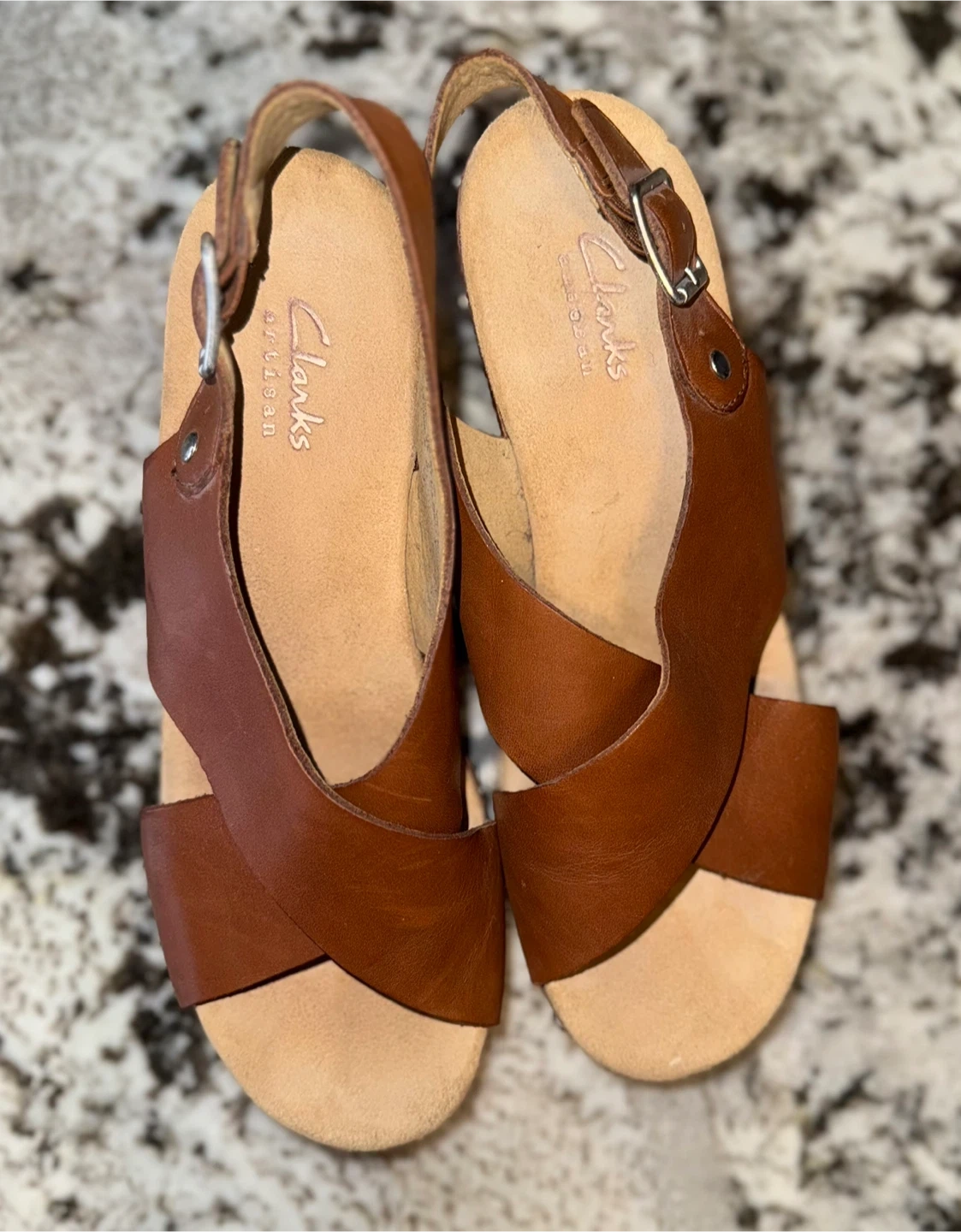 Selling Clarks Artisan sandals, size US 7. Tan leather straps, wood style platform heel, rivets. Worn just twice; gentle signs of use but overall good shape. Stylish and versatile (dress up or casual). Pickup Yorkdale (Dufferin & Wilson).