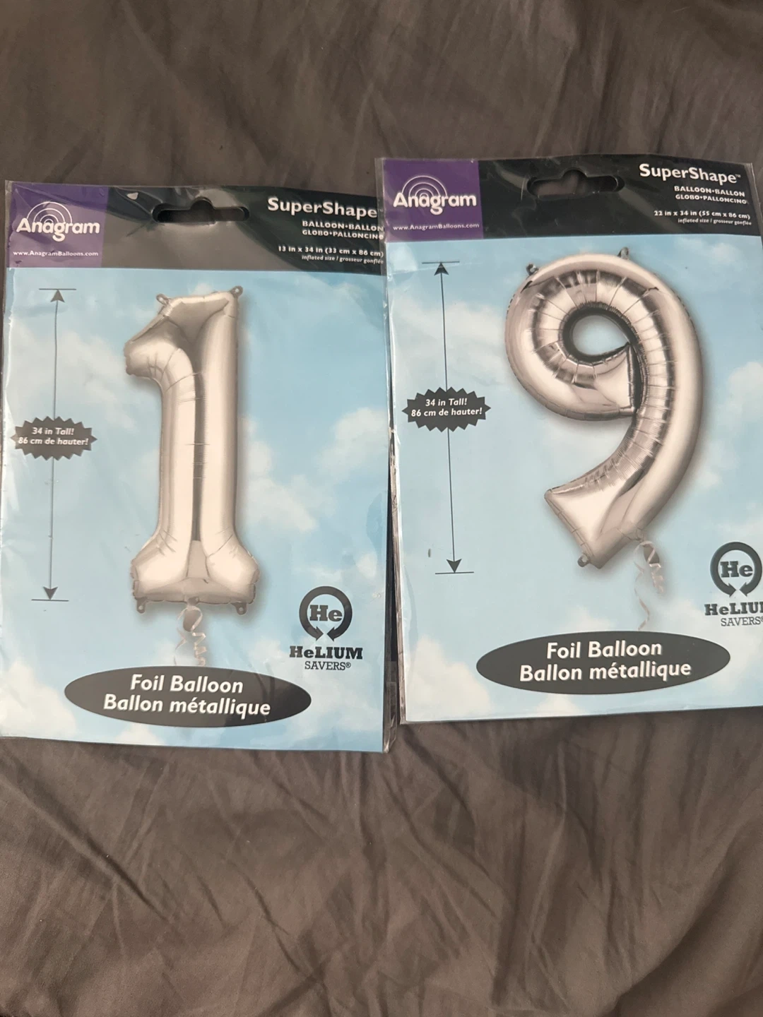 1000+Selling a set of Anagram foil balloons, numbers 1 and 9! They are 34 inches tall (86 cm). Perfect for a birthday party or any celebration! They are still in their original packaging. $2 each
