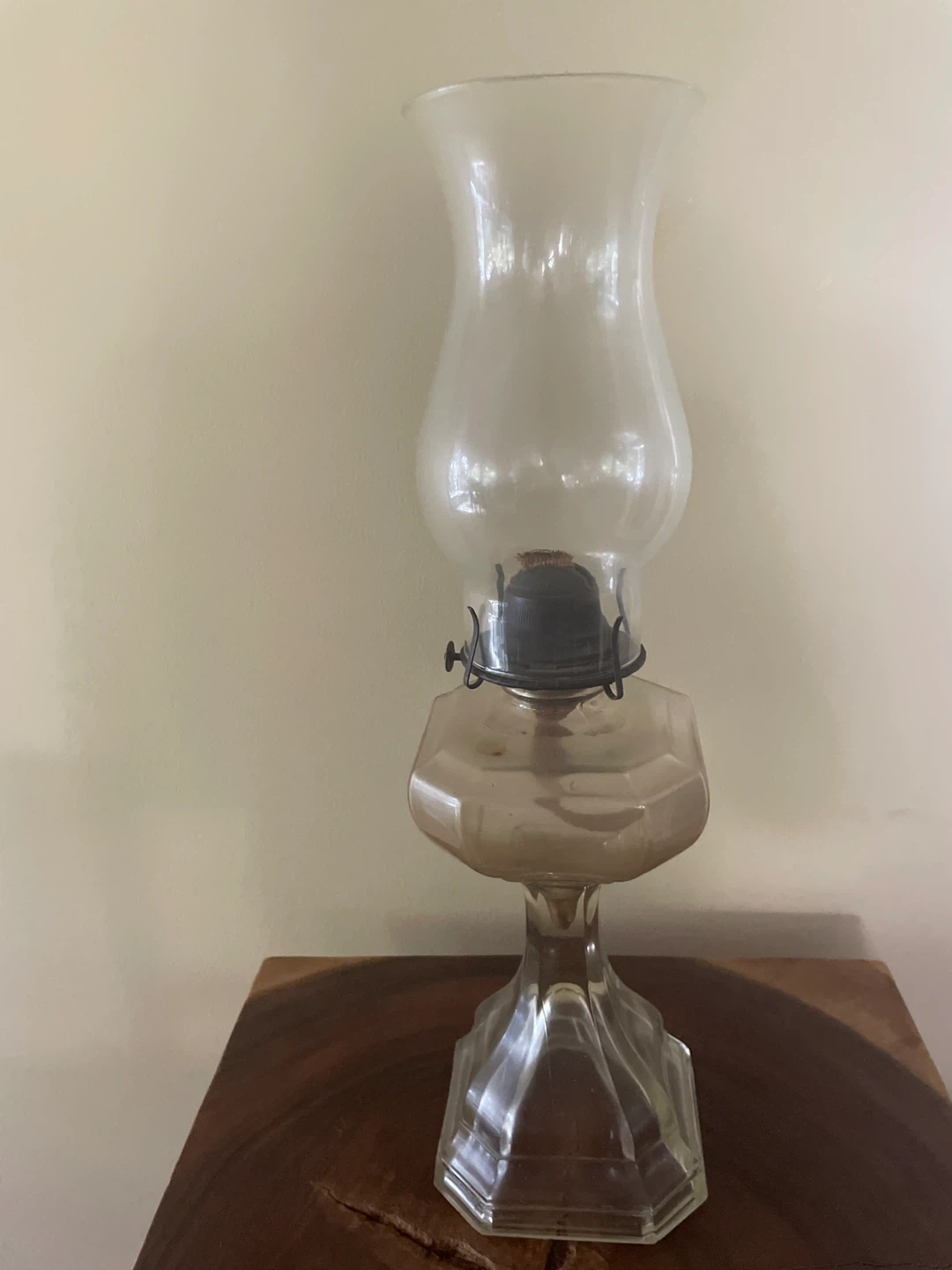 Selling a vintage glass oil lamp. It's in good condition and would make a great addition to any home! It has a unique design and is sure to be a conversation starter