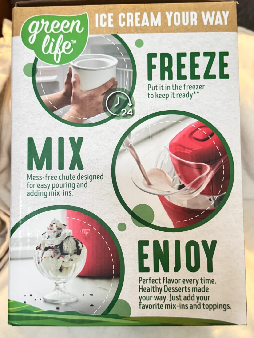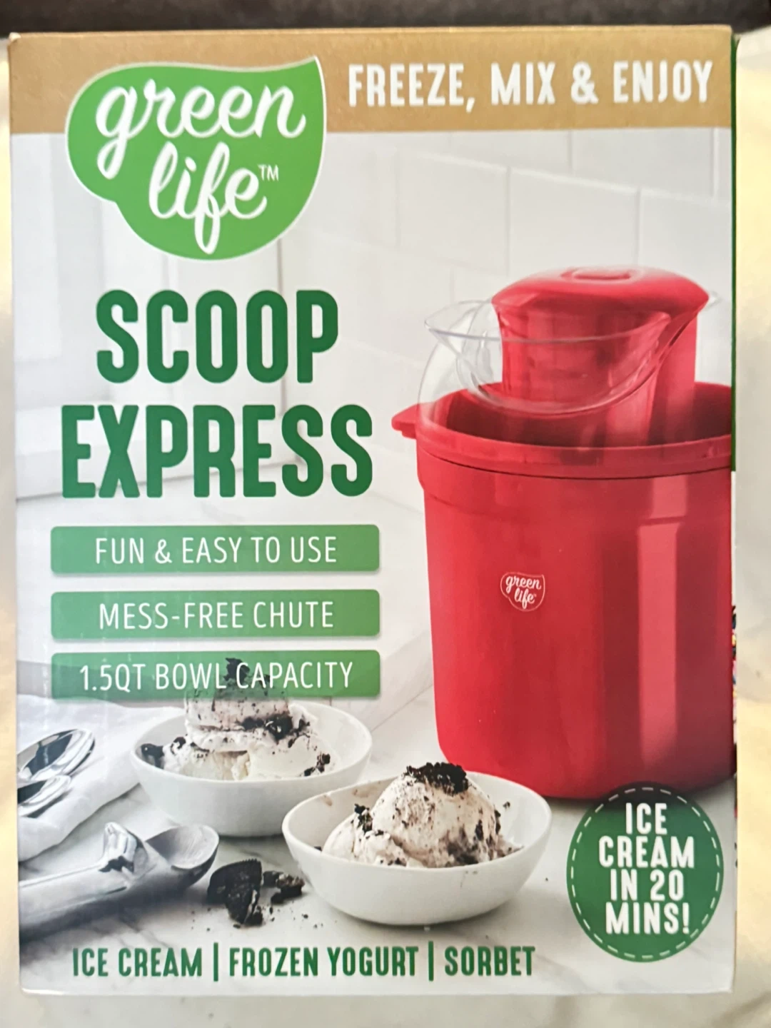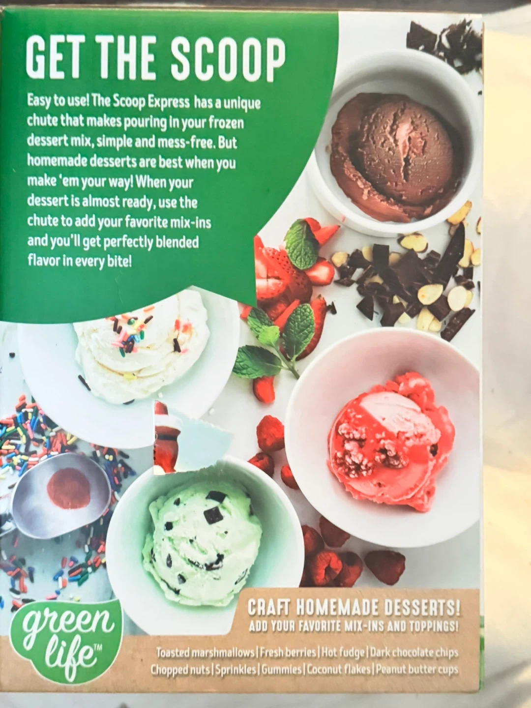76Make delicious homemade ice cream, frozen yogurt, or sorbet in just 20 minutes with the Green Life Scoop Express! It features a mess-free chute for adding your favourite mix-ins and a 1.5QT bowl capacity. It's easy to assemble and clean, plus it's BPA free! The mixing paddle and base are dishwasher safe Brand new in box