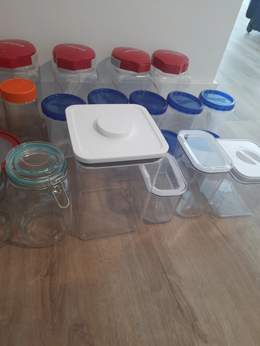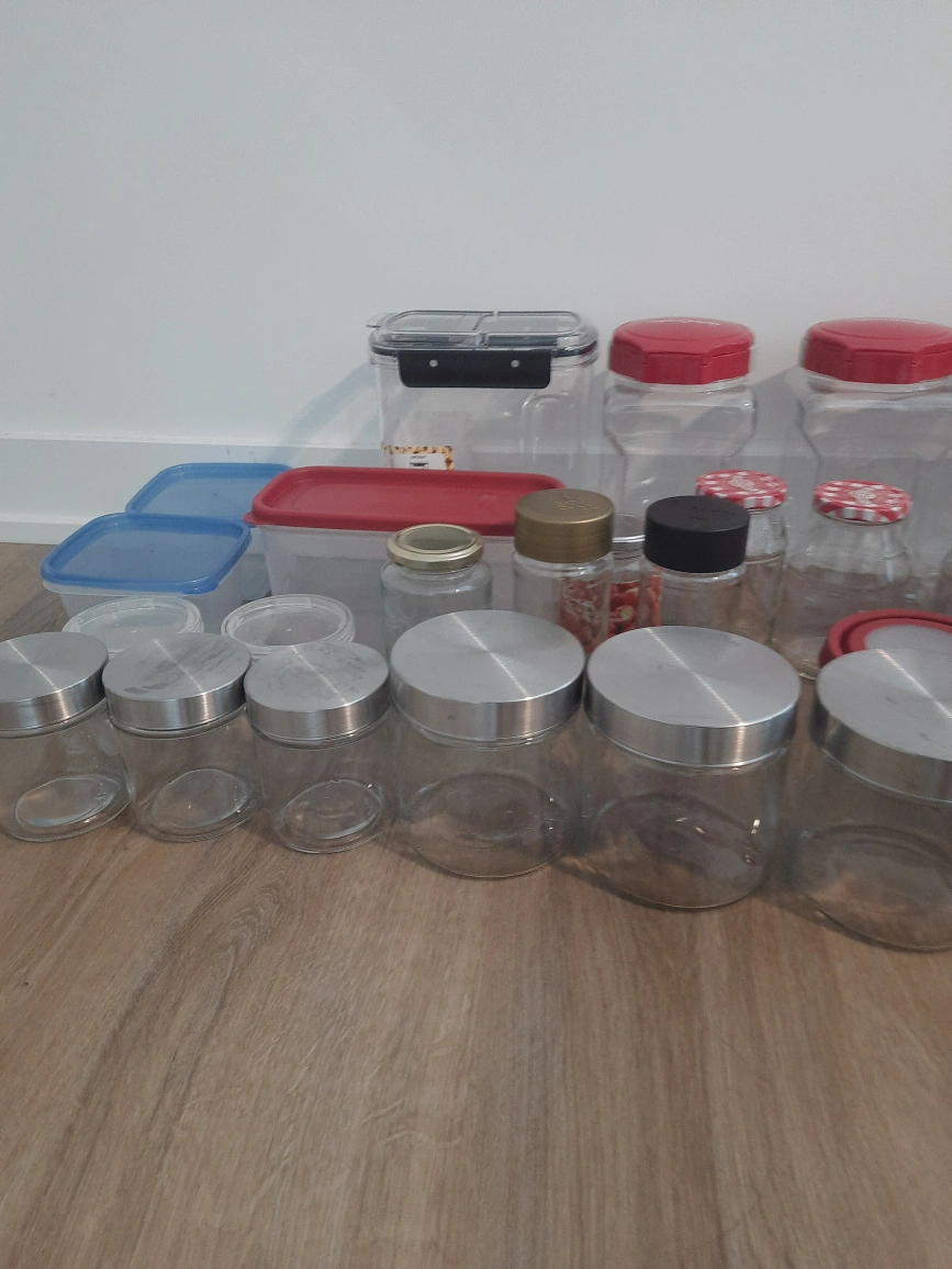 Selling a collection of various food storage containers. There are different sizes and shapes, perfect for organizing your pantry or fridge. Includes glass jars with metal lids and plastic containers with coloured lids. They're all in good condition and ready for a new home