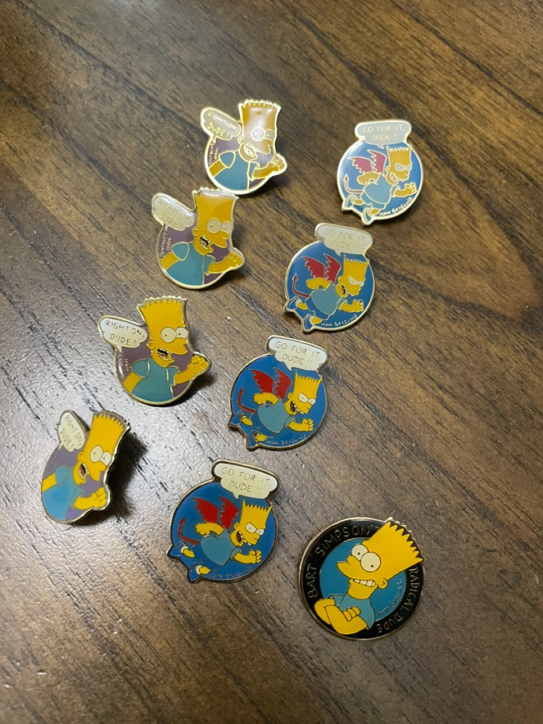 Selling a collection of The Simpsons Bart Simpson enamel pins! Each pin features Bart in different fun designs and sayings like "Go For It Dude!!" and "Right On, Dude!". These are great for any Simpsons fan or pin collector!