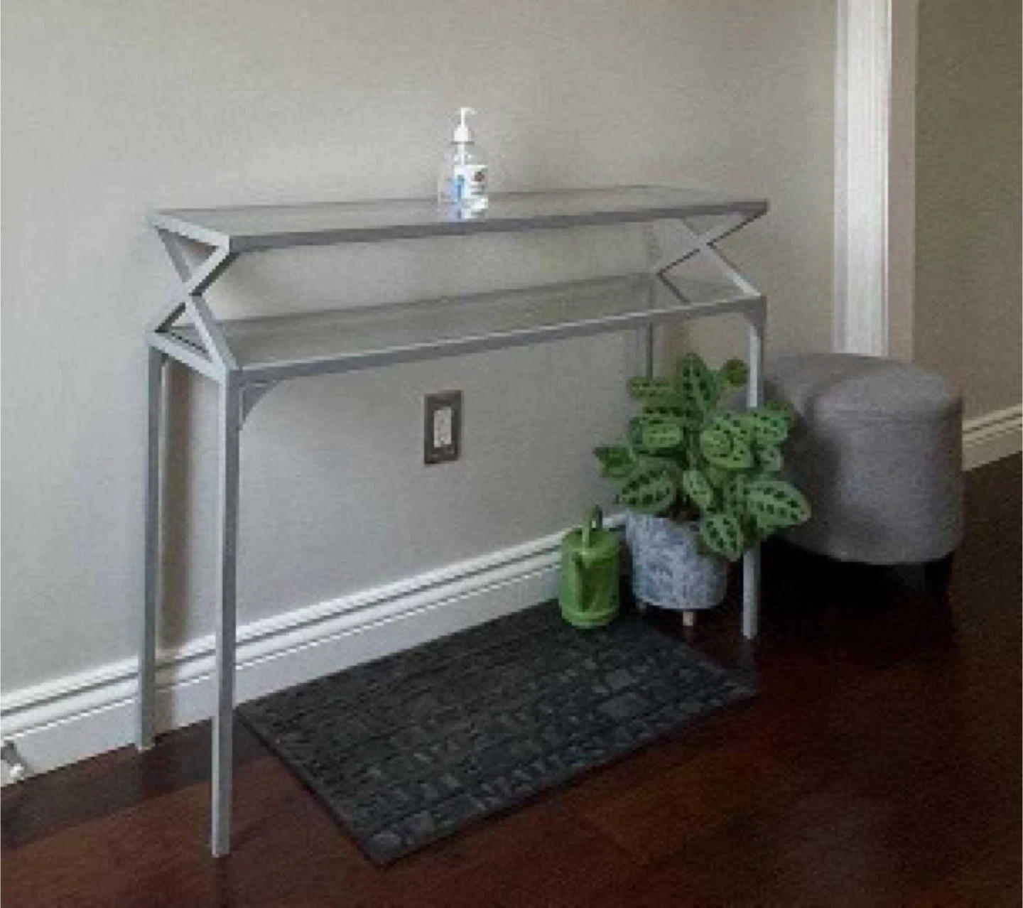 220A stylish silver console table, perfect for an entryway or hallway! It features a modern design with a geometric frame and two tiers for storage or display. 42”l x 12”d x 32”h. Pick up at Weston and Eglinton.