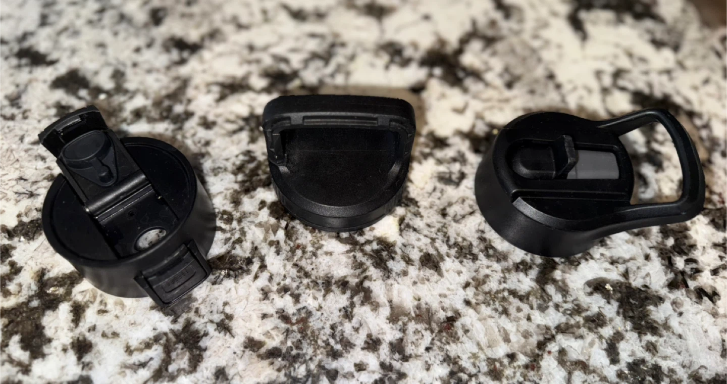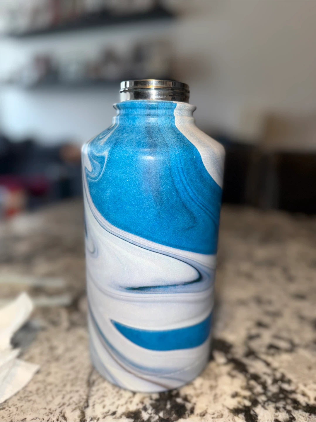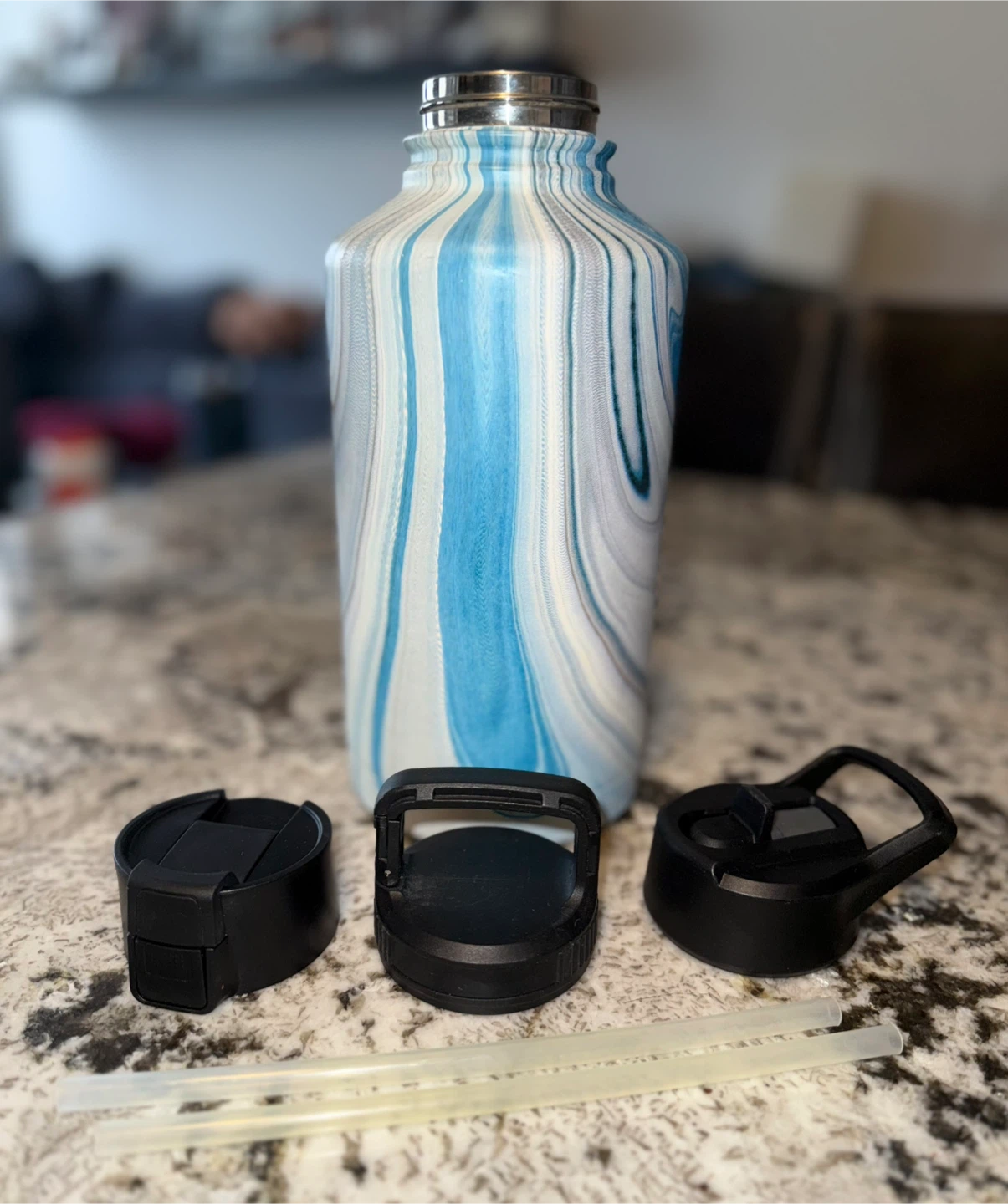 FineDine water bottle (64 oz) with gorgeous marble pattern and 3 interchangeable lids: straw (with 2 straws), flip-top, and handle. Great for gym, travel, or everyday hydration. Wide-mouth and leakproof.