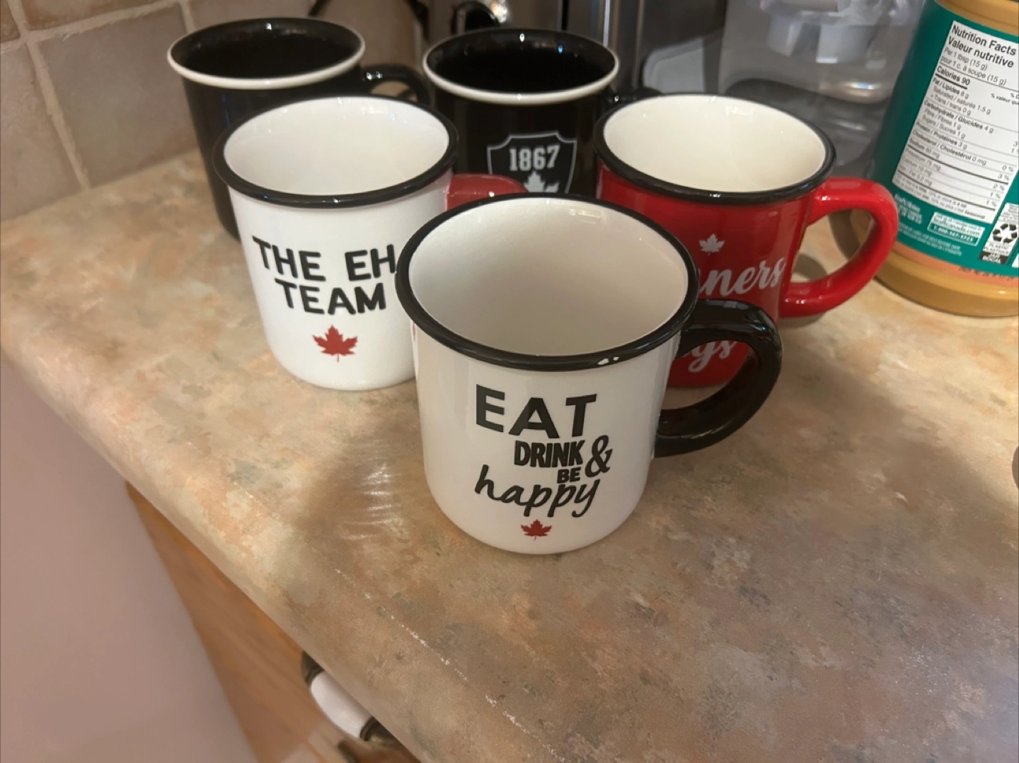 243Selling a set of five mugs with a Canadian theme! There are a variety of designs and colours, including black, white, and red. They're perfect for adding a bit of Canadian charm to your morning coffee or tea. Great condition!