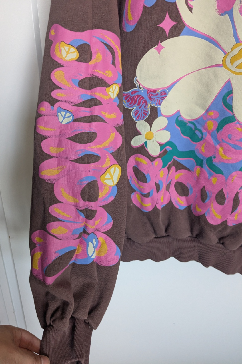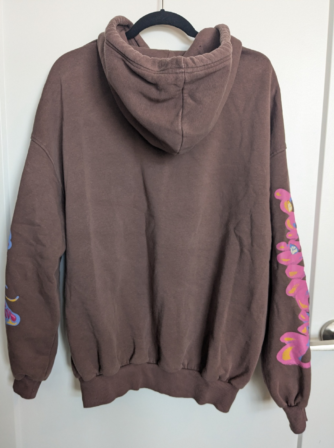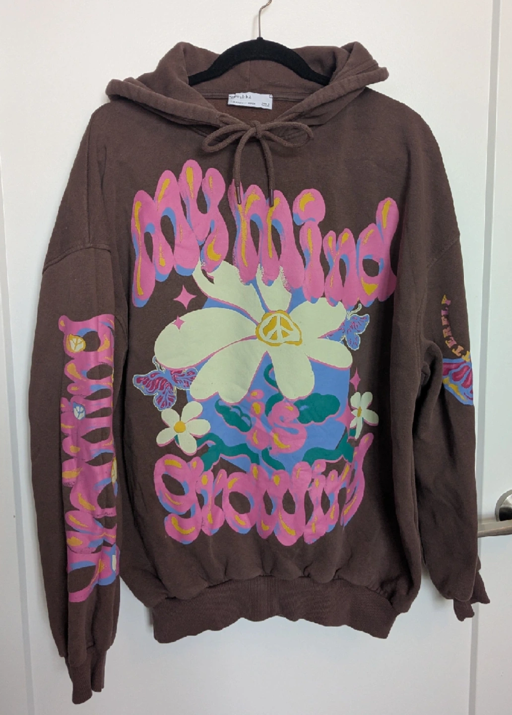 Super cozy oversized brown hoodie from Bershka featuring a really cute 70s pink and white print on the front and designs on the sleeves as well ! Size XS, fits S, and up to a M. In great condition, worn maybe twice and hung up.