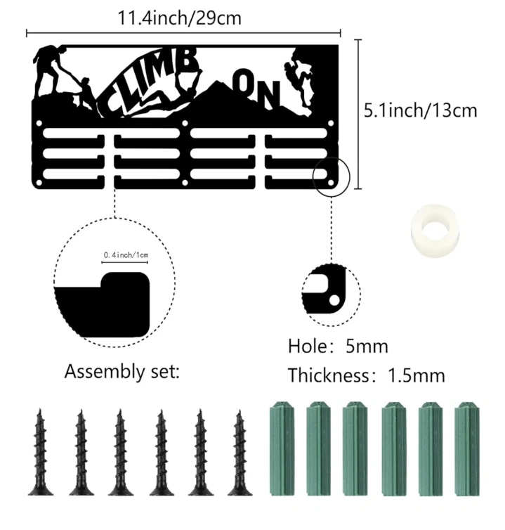 Display your hard-earned medals with this Climb On medal hanger! It can hang more than 60 medals and has an intelligent non-slip stop block. The rack has 3 separate hooks and a super loading capacity of up to 5kg/11lb. Assembly hardware including 6 anchors and 6 screws is included.