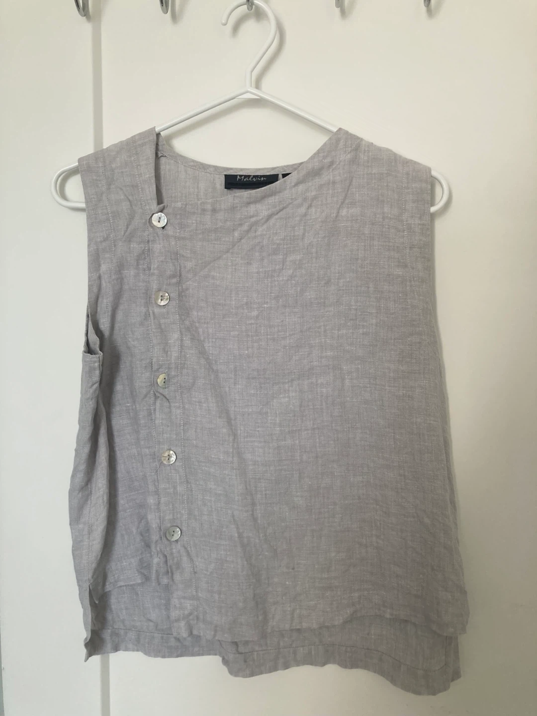 Selling a gently used Malvin sleeveless top! It features a unique button-down design and is made of comfortable linen material. Perfect for a casual, breezy look!