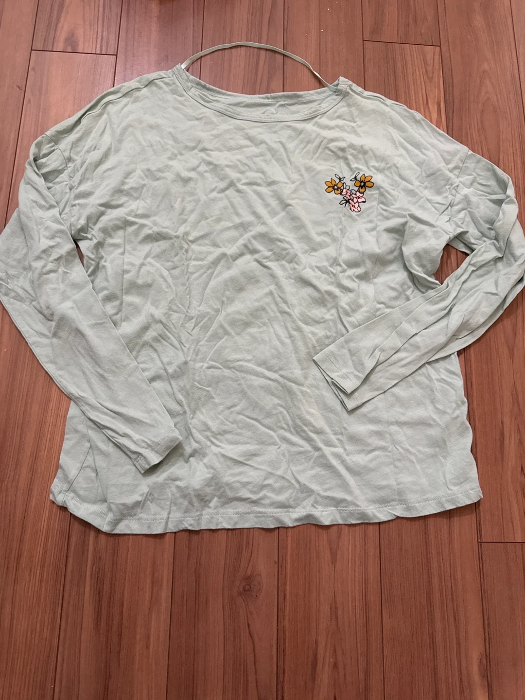 A cute and comfy long sleeve top from Joe Fresh. It's a light green colour and size medium. Features a small floral design on the chest. Perfect for layering or wearing on its own!
