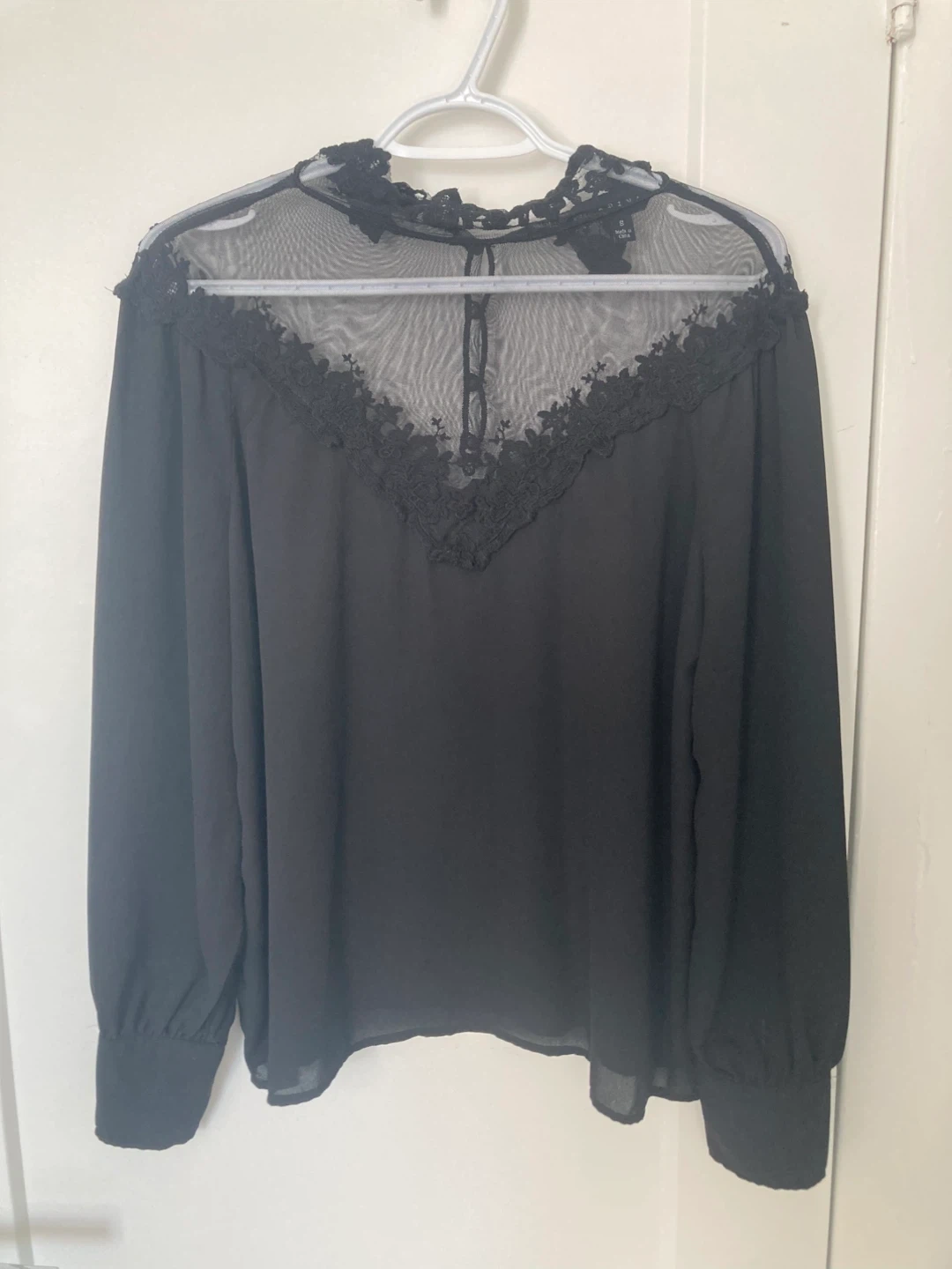 212Selling a lovely black blouse with sheer lace detailing. It's a size 8 and in great condition! Perfect for dressing up or down