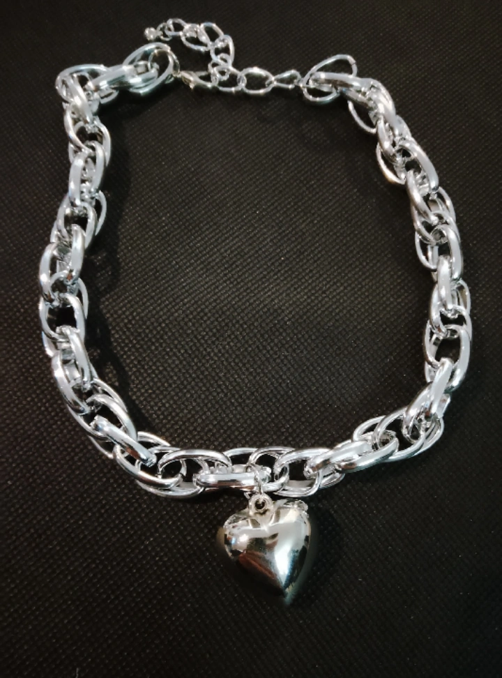 The necklace features a silver chain with a heart-shaped pendant.