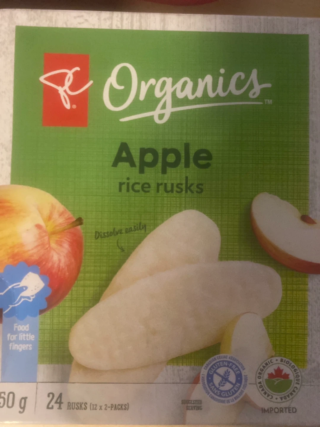 Selling a box of PC Organics Apple Rice Rusks! These are perfect for little fingers and dissolve easily. They're also gluten-free and organically made for a suggested serving.