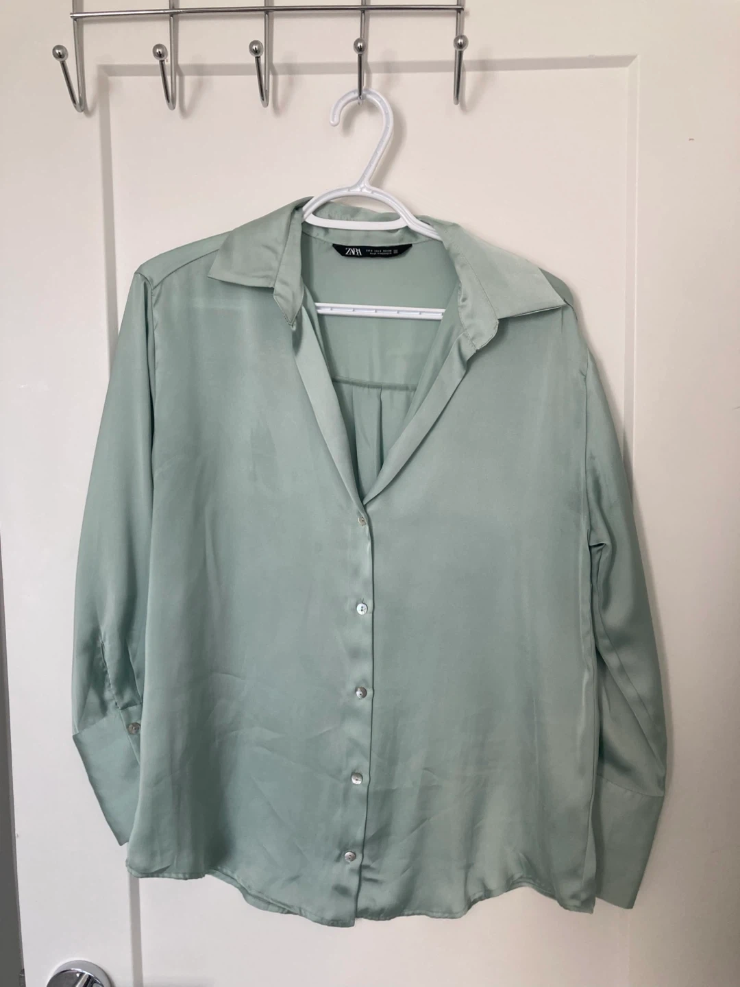 A stylish green button-up blouse from Zara! It's a size small and in great condition. Perfect for dressing up or down, this blouse is a versatile addition to any wardrobe