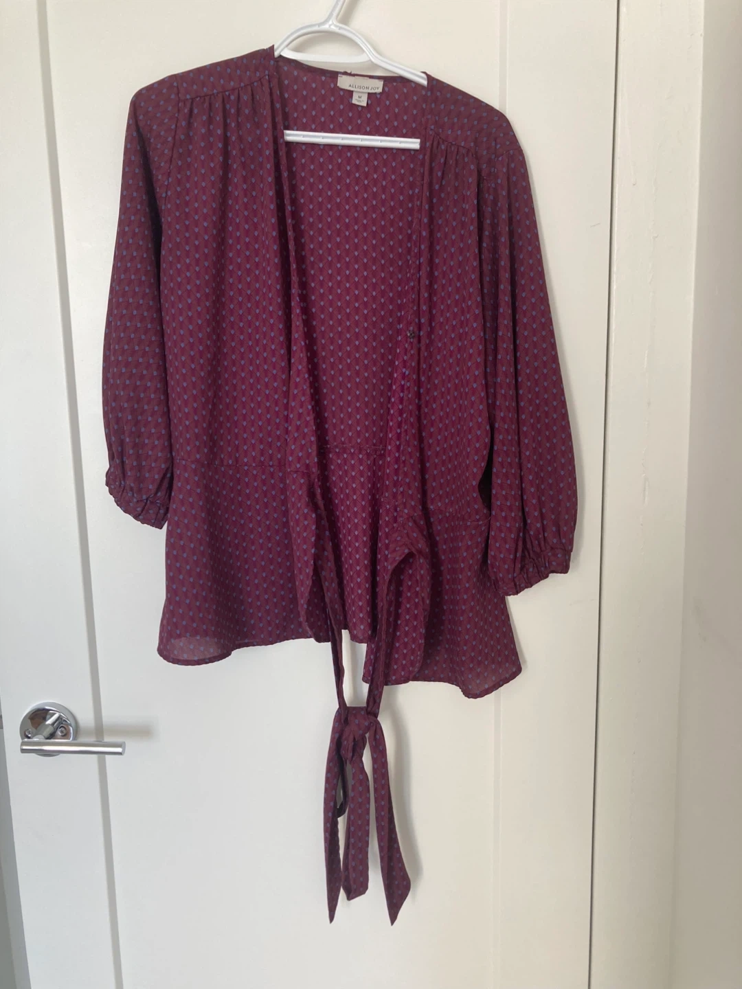 Selling a gently used Allison Joy blouse in size medium! It's a burgundy colour with a subtle pattern. The blouse features long sleeves and a tie at the waist. Perfect for a casual or dressed-up look