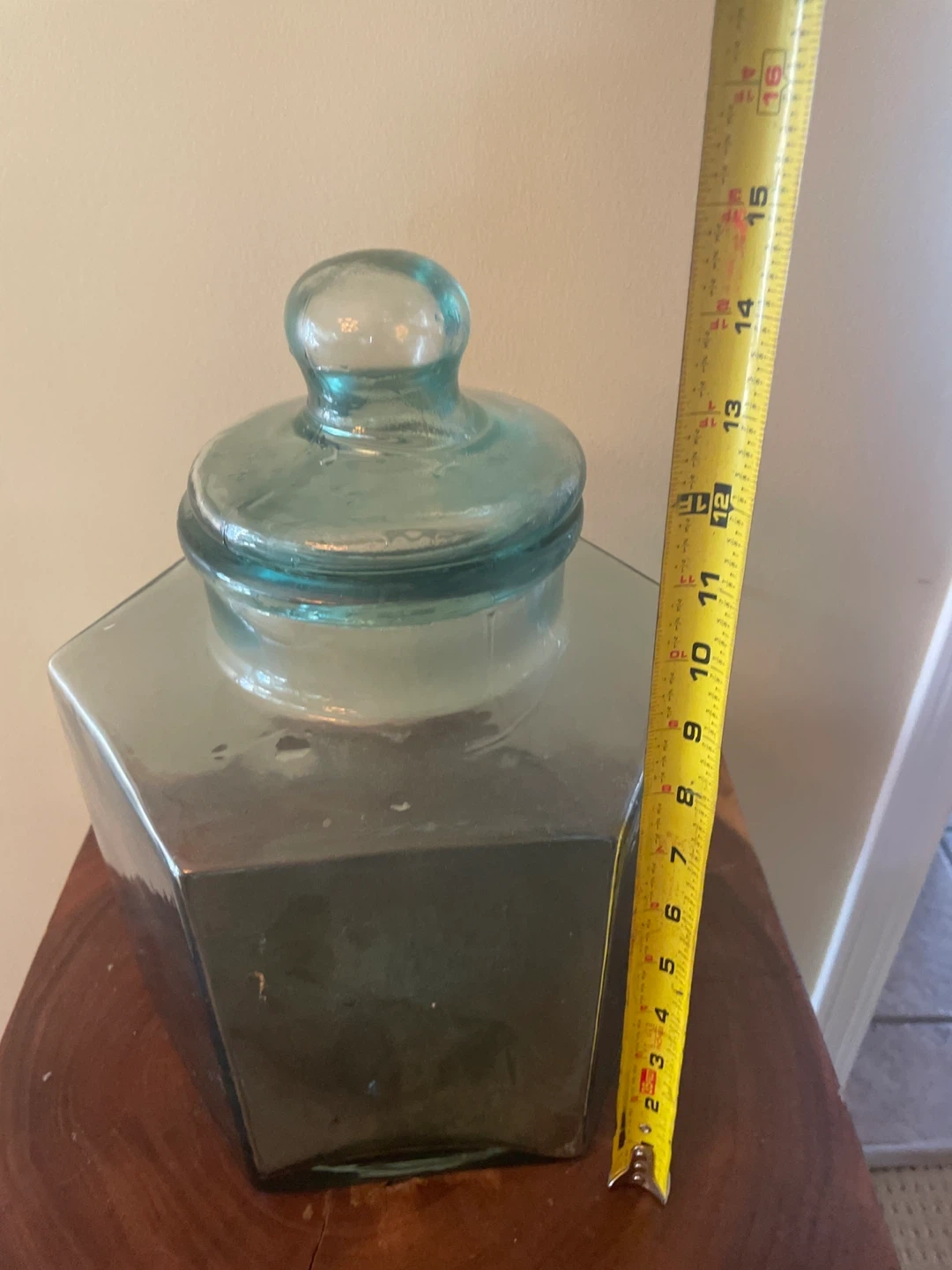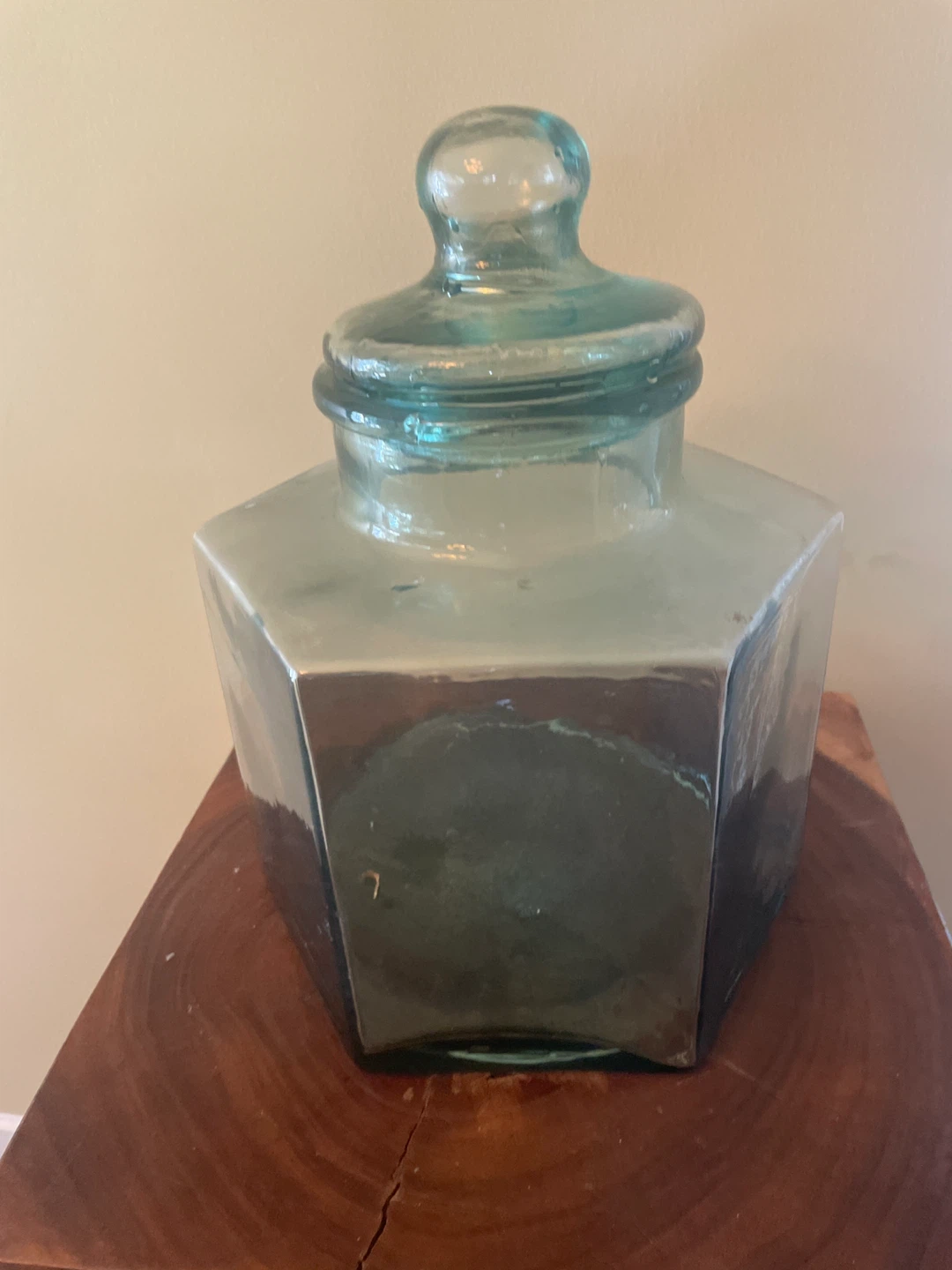 A lovely large glass apothecary jar with a matching lid. It's in great shape and would look fantastic in any room. The jar measures approximately 12 inches tall and 8 inches wide. Perfect for storage or decoration!