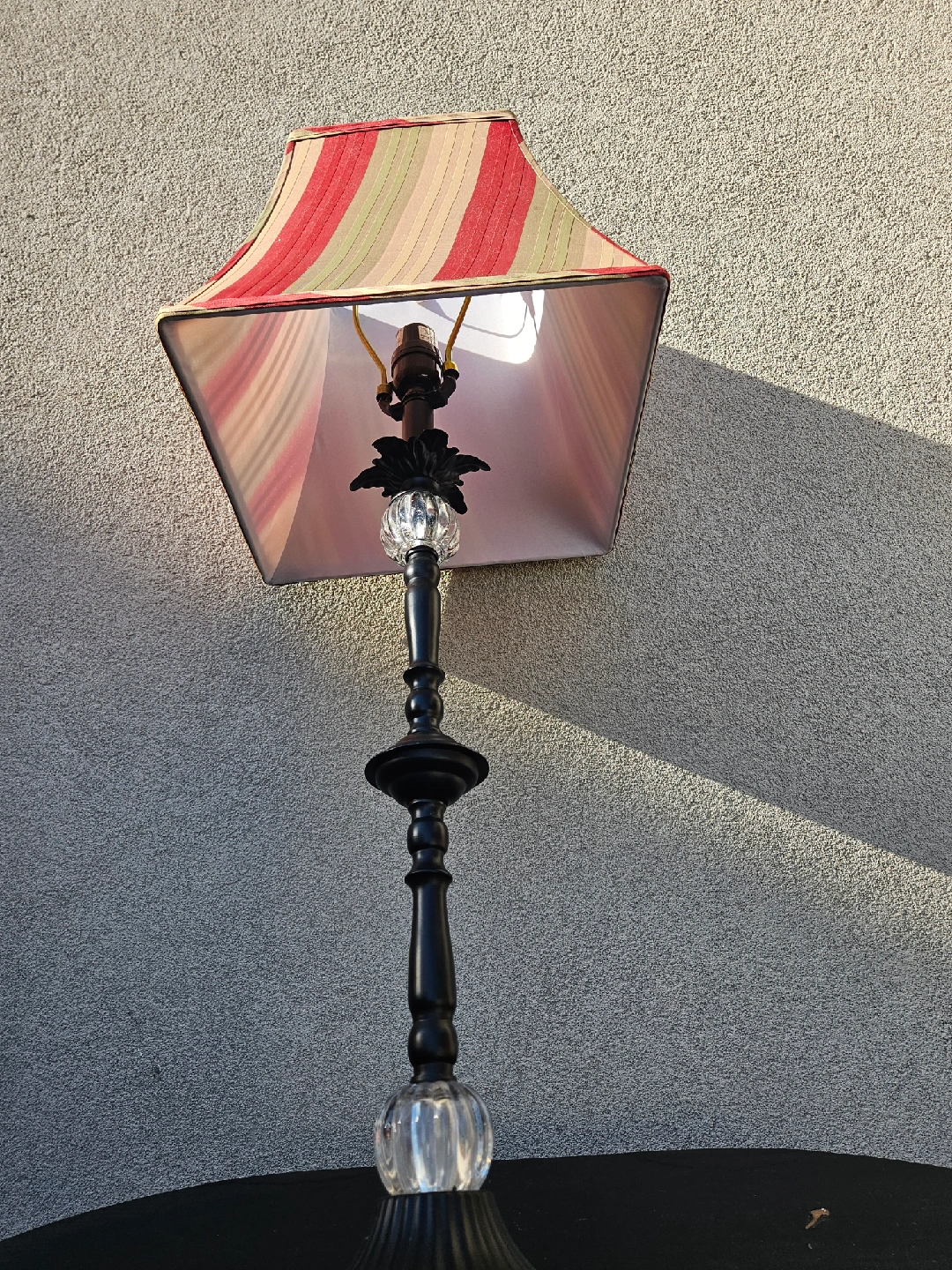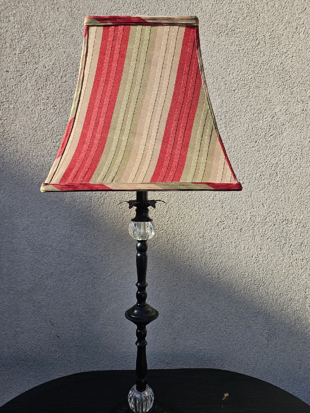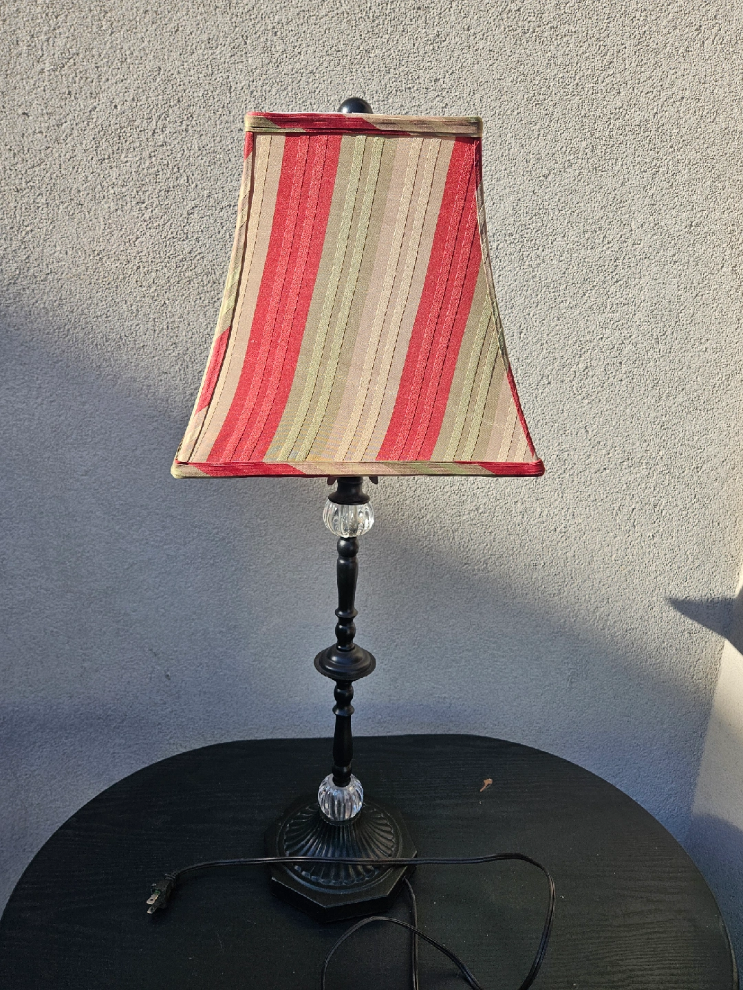 This table lamp features a black stand with clear glass accents and a striped shade. It would look great on a bedside table or desk!