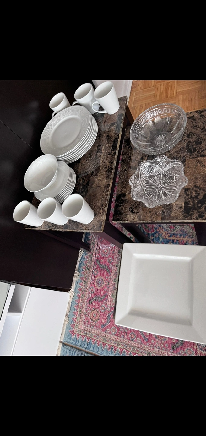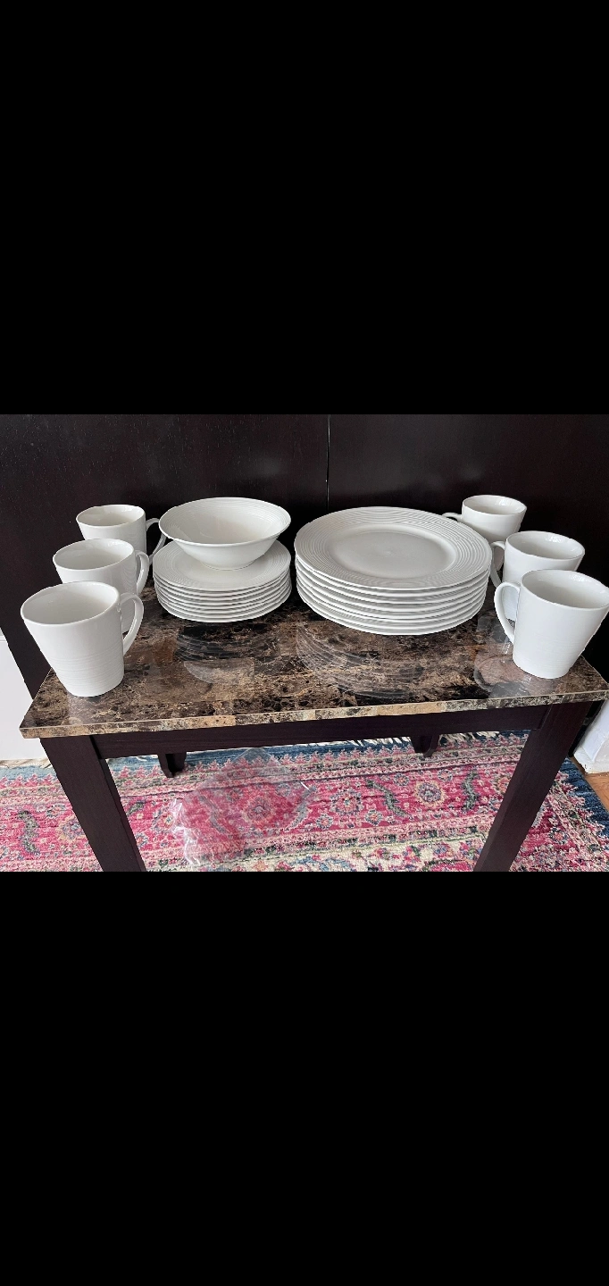 Selling a white dinnerware set. Includes plates, bowls, and mugs. Perfect for everyday use or special occasions