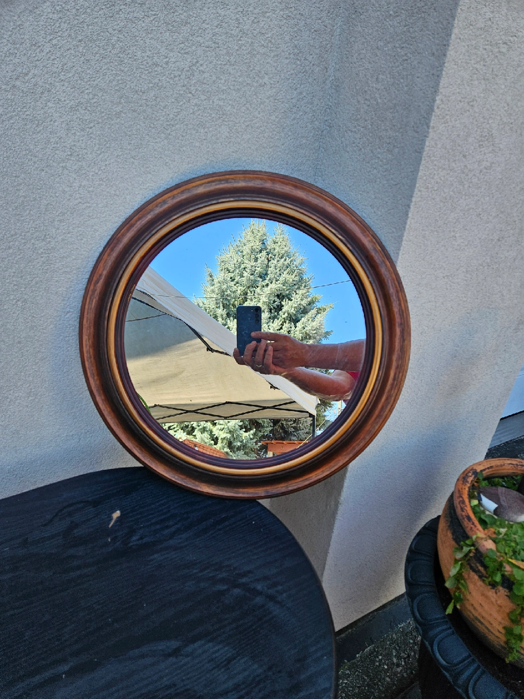 Selling a round wall mirror with a wooden frame. It's in great shape and ready to hang in your home. The mirror measures approximately 16 inches in diameter, which makes it a perfect size for an entryway or small space
