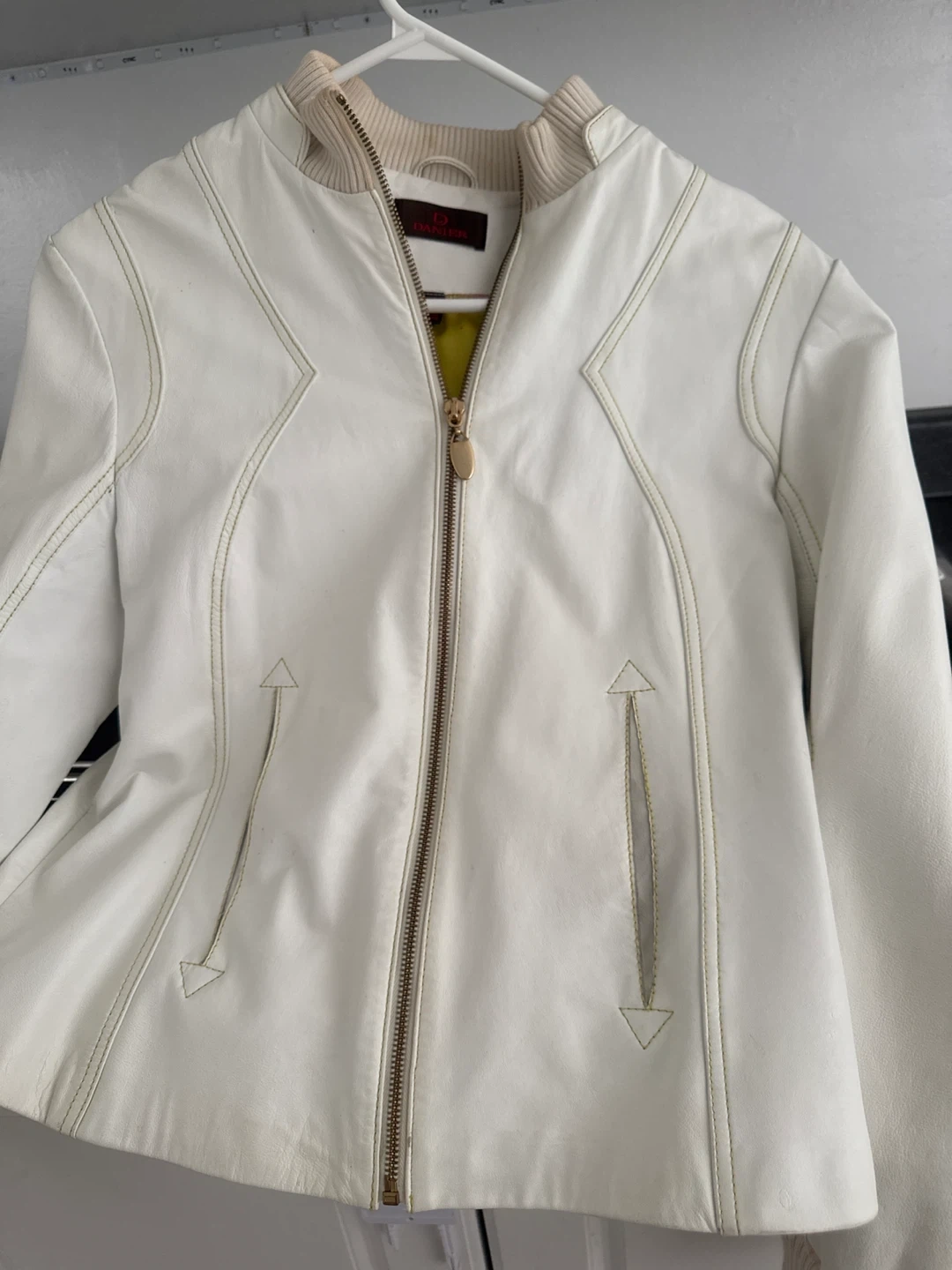Here's a stylish white leather jacket from D. Darien! It's perfect for adding a chic touch to your outfit. The jacket features a zippered front and unique detailing.