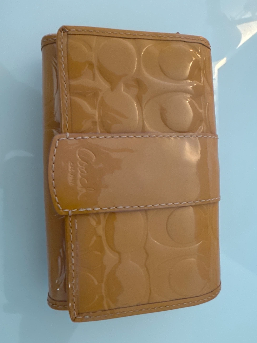 Selling a Coach wallet in a light brown/tan colour. It has a snap closure and lots of slots for cards and cash. There are some signs of wear on the exterior, but the interior is in good condition