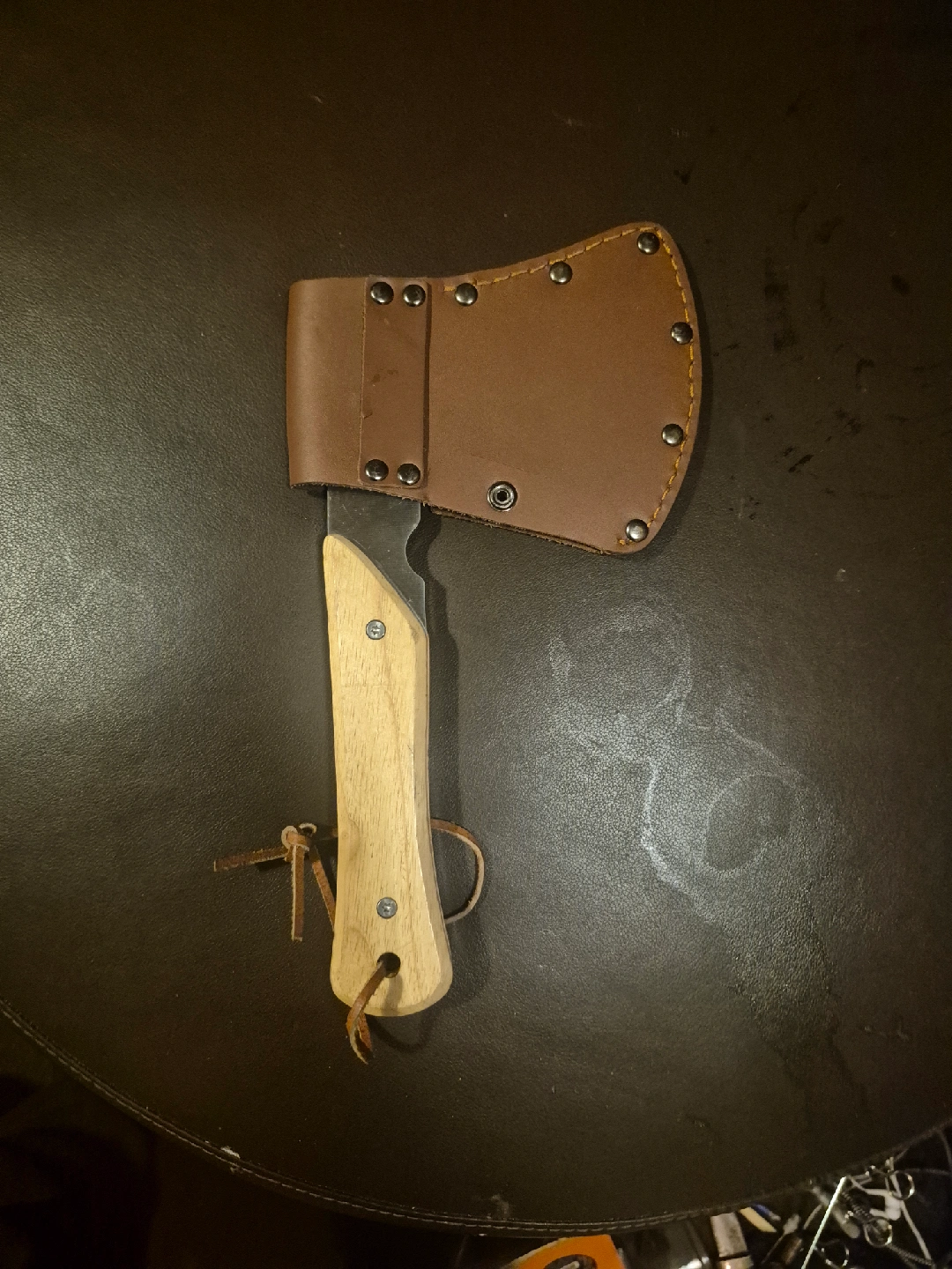 Selling a Woods axe. It comes with a sheath for safe storage and transport. The handle is made of wood and it has a leather lanyard. Great for camping or outdoor use!