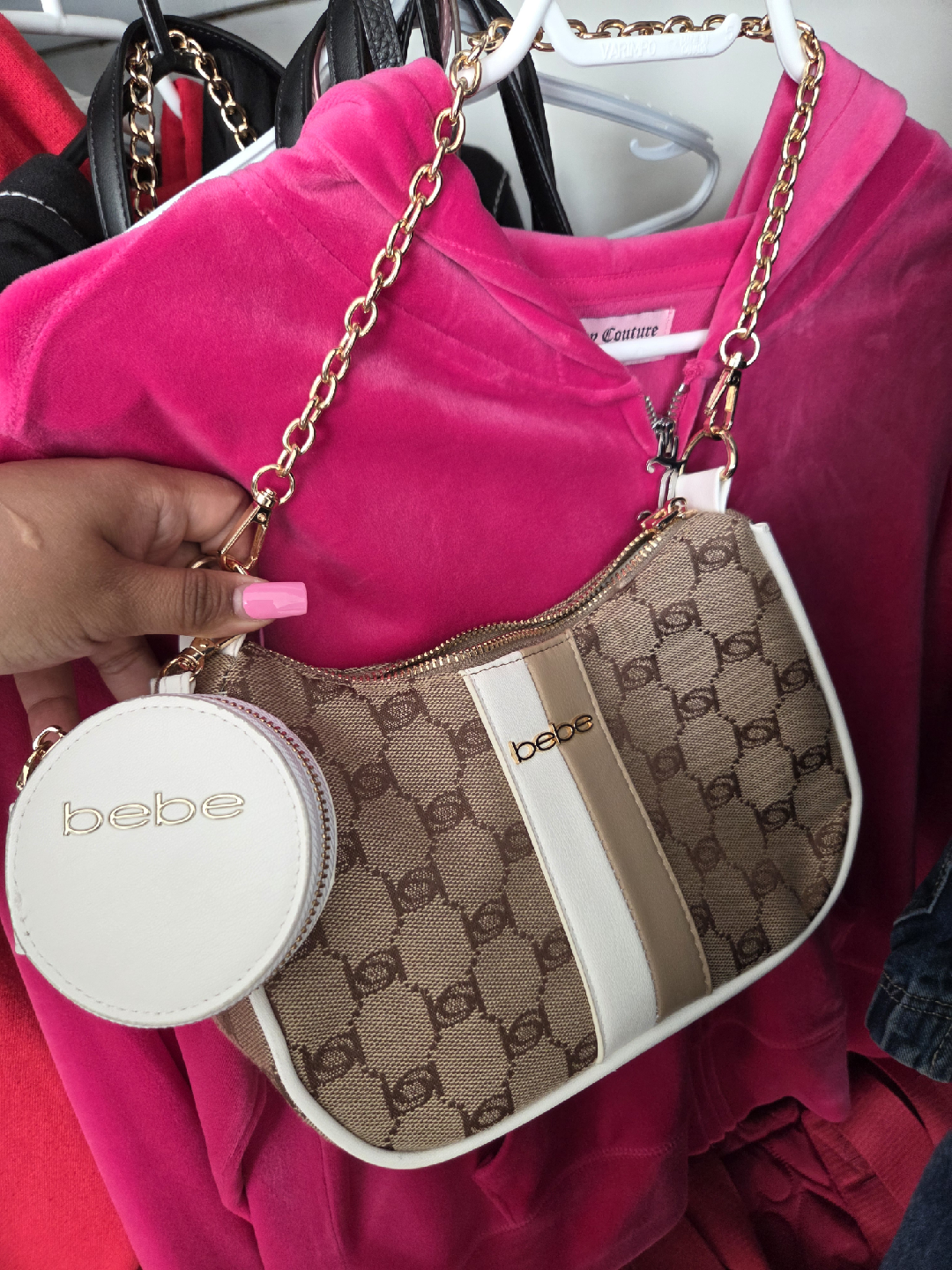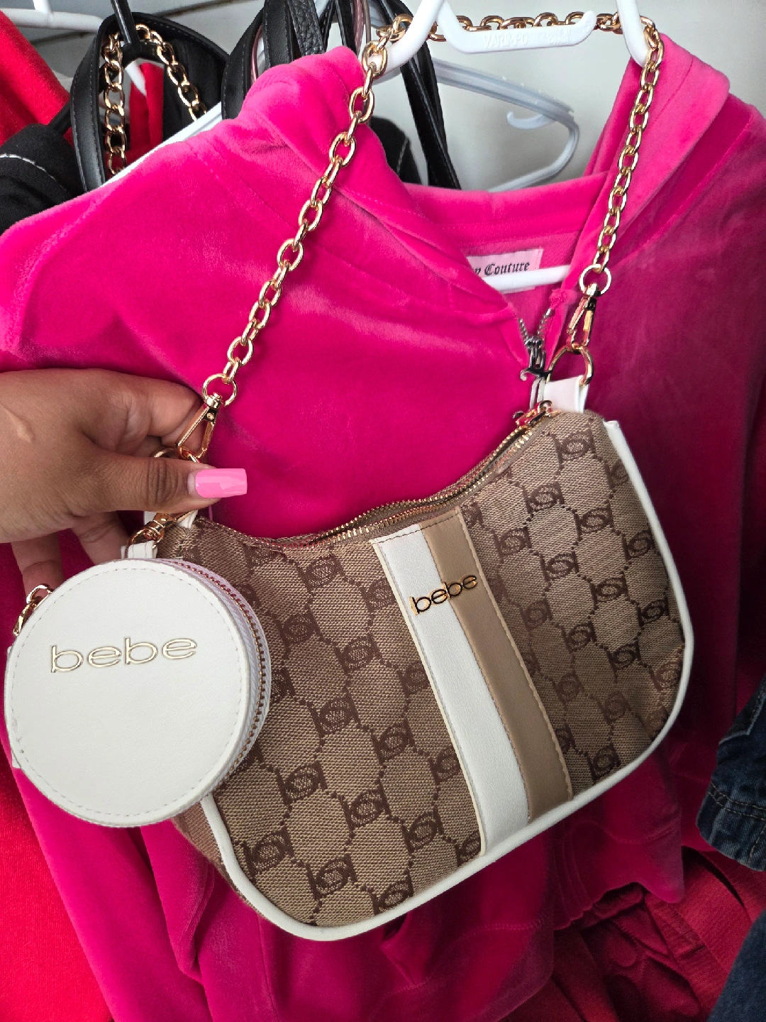 Selling a cute Bebe shoulder bag with a brown patterned design and a detachable round coin purse! It has a gold chain strap and is in great condition