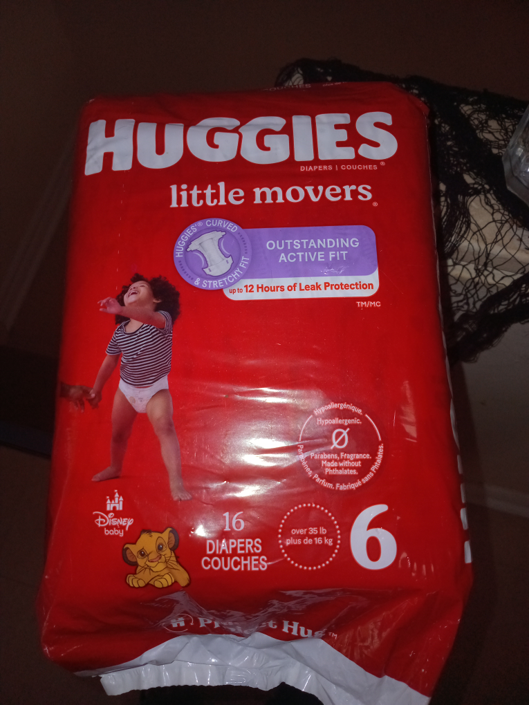 Selling a pack of Huggies Little Movers diapers, size 6. These are designed for babies over 35 lb (plus de 16 kg). They feature a curved and stretchy fit for outstanding active fit and up to 12 hours of leak protection. Hypoallergenic and made without parabens, fragrance, or phthalates. There are 16 diapers in this pack. Pick up at Jane and Finch.