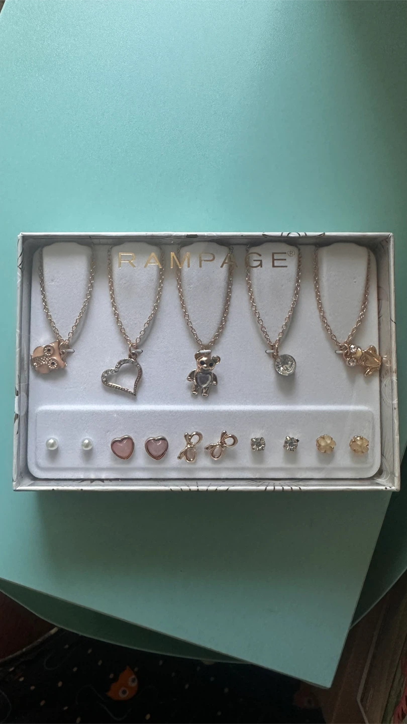 Selling a cute Rampage necklace and earring set! It includes a variety of necklaces with different charms like an owl, heart, teddy bear, and frog. There are also several pairs of earrings included in the set