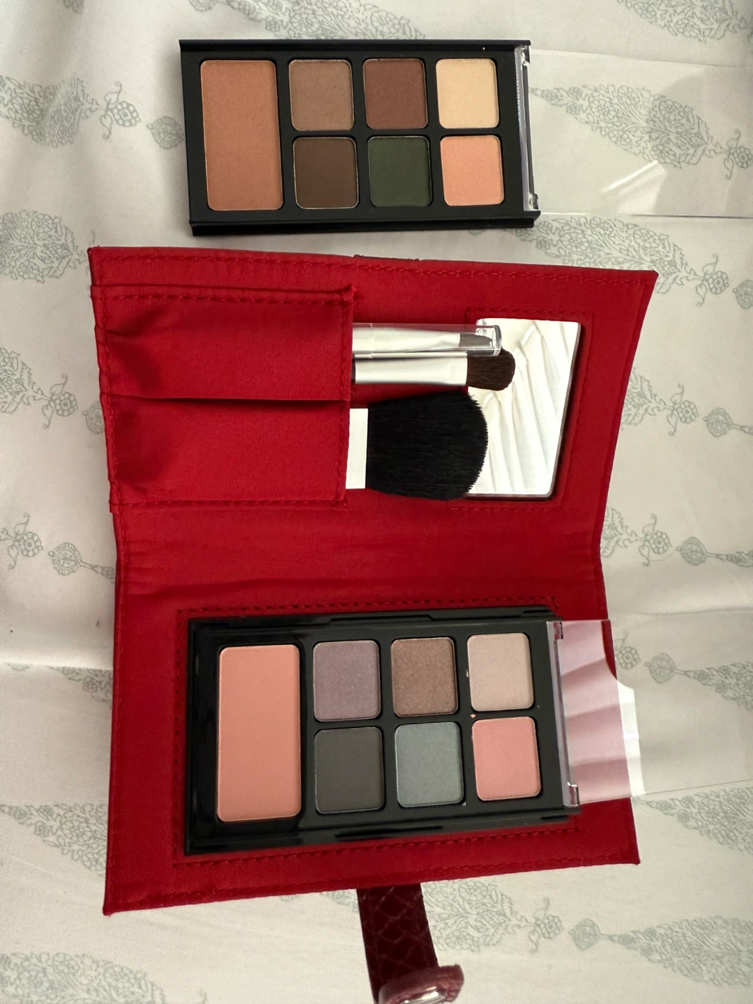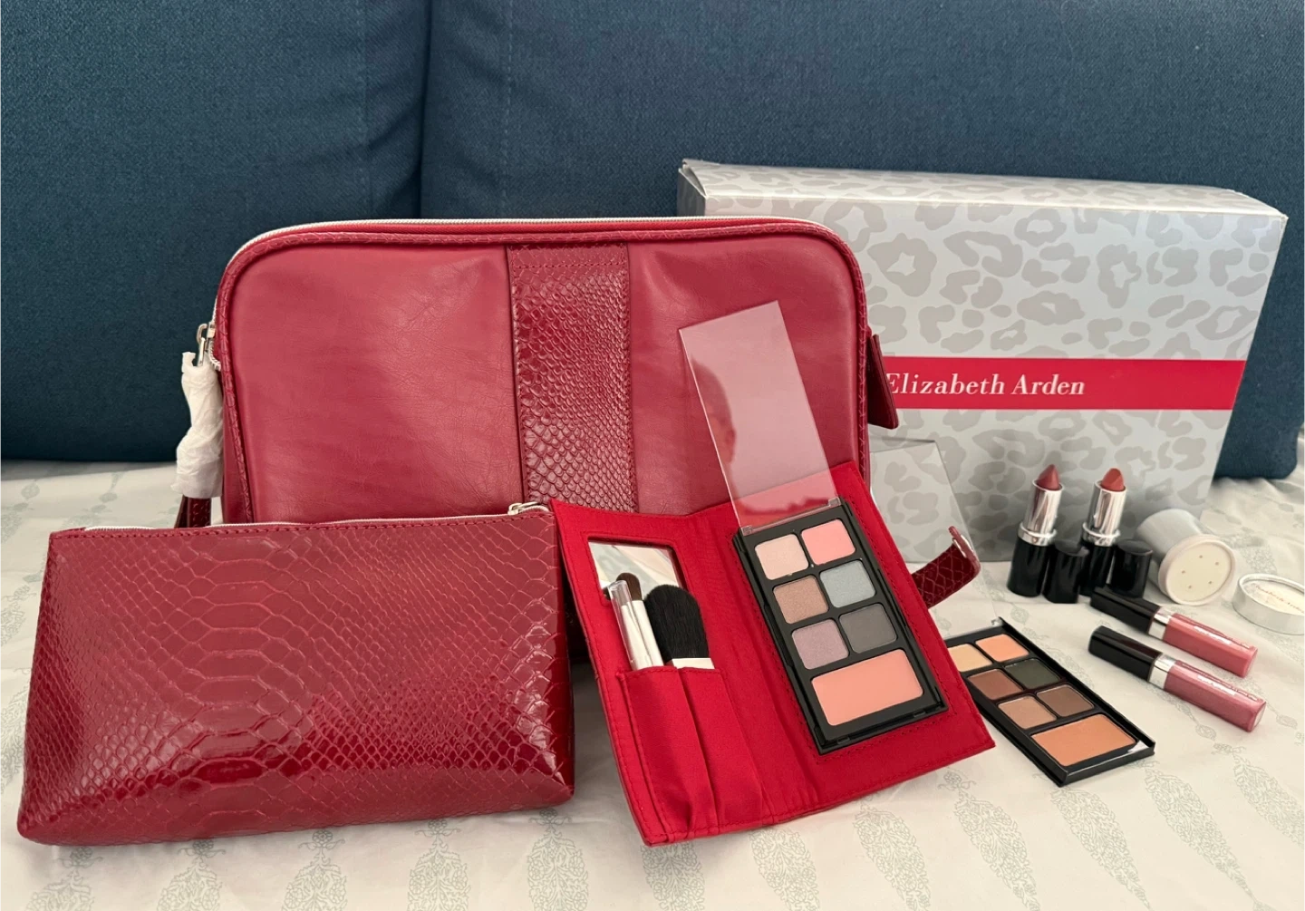 Selling an Elizabeth Arden makeup set that includes lipsticks, lip glosses, eye pencils, a powder, blush, and eyeshadow palettes. Also comes with a makeup brush and a red makeup bag to keep everything organized