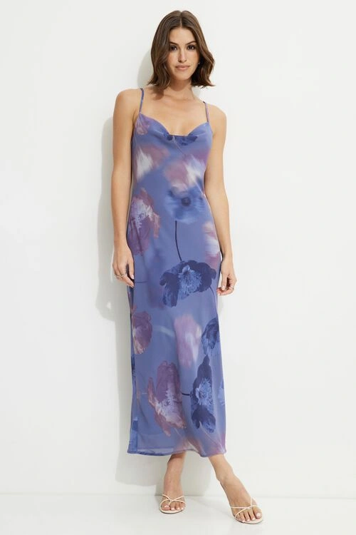 This is a beautiful maxi dress with a floral print. It features a cowl neck and spaghetti straps. Perfect for a summer day or evening out!