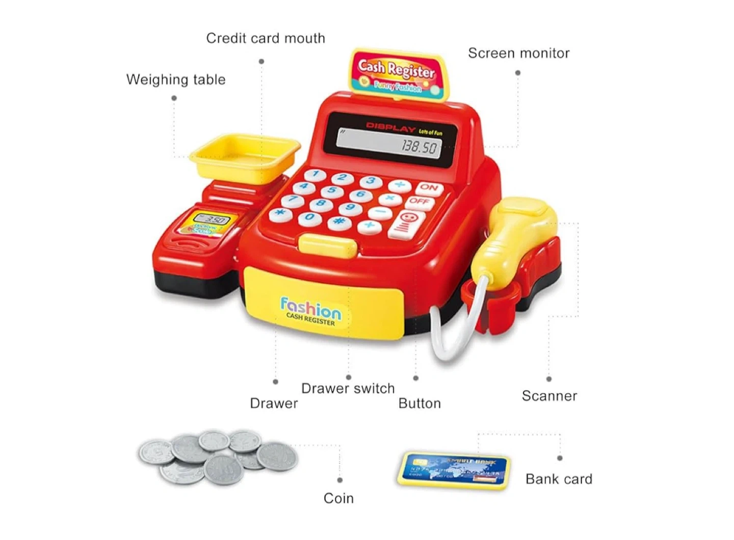 Kids will love to play alone or with friends with this toy cash register, pretend they are like a cashier helping people buy food or goods, and spend it with game money.