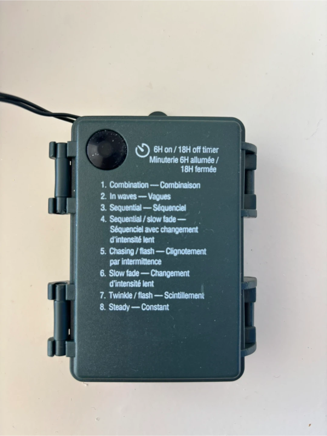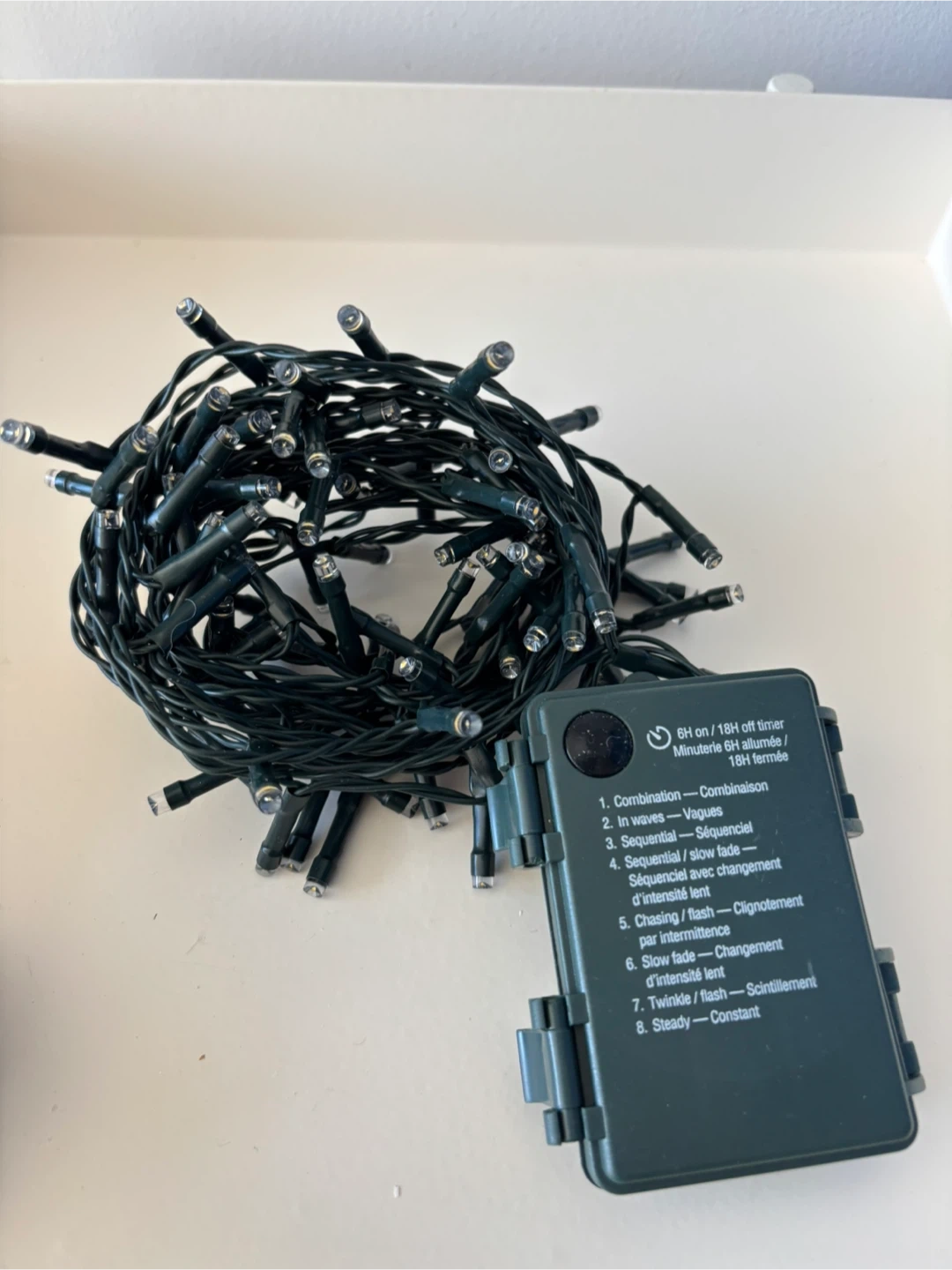 Selling a set of string lights that come with a timer! The timer has settings for 6 hours on and 18 hours off. There are also 8 different light modes to choose from, including combination, in waves, sequential, slow fade, chasing/flash, twinkle/flash, and steady