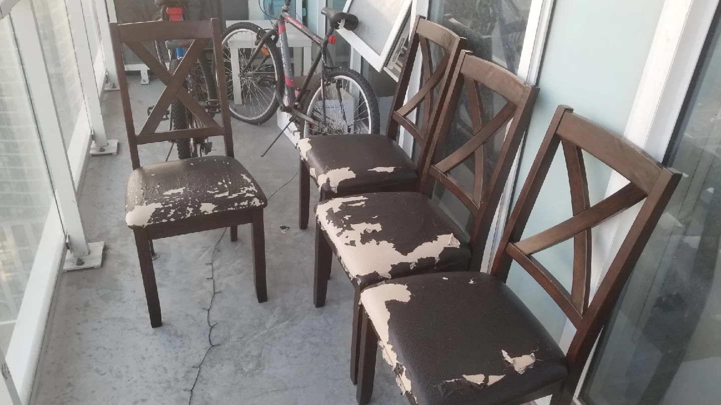 Selling a set of 4 wooden dining chairs. They have a classic cross-back design. The seats show some wear and tear, as pictured, but the frames are sturdy and in good shape. Perfect for a kitchen or dining room!