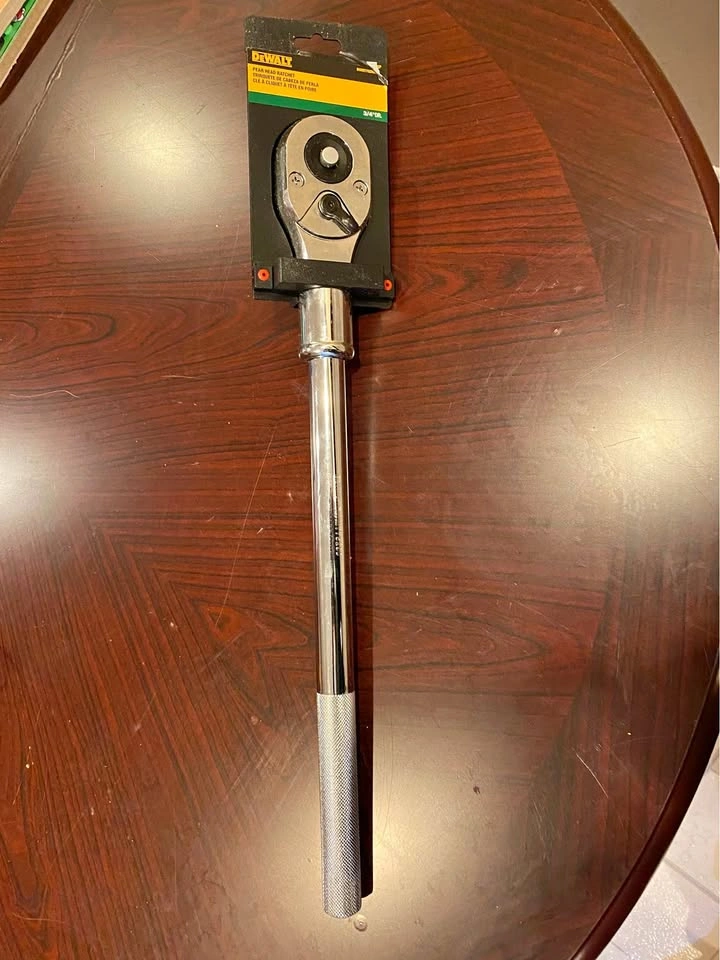 Brand new Dewalt ratchet 3/4" still in packaging. Retails for $144+ taxes ($162.72) Model # DWMT75290OSP The Pear Head Quick Release Ratchet has a 5 degree arc swing making it easy to maneuver in restricted areas. Its contoured, ergonomically designed handle with anti-slip grooves help make this ratchet extremely comfortable to use and provides added control Low profile directional lever 72 tooth gear system for high torque ratcheting Chrome Vanadium steel construction for strength and durability Size stamped twice on both sides of wrench handle for easier size identification.