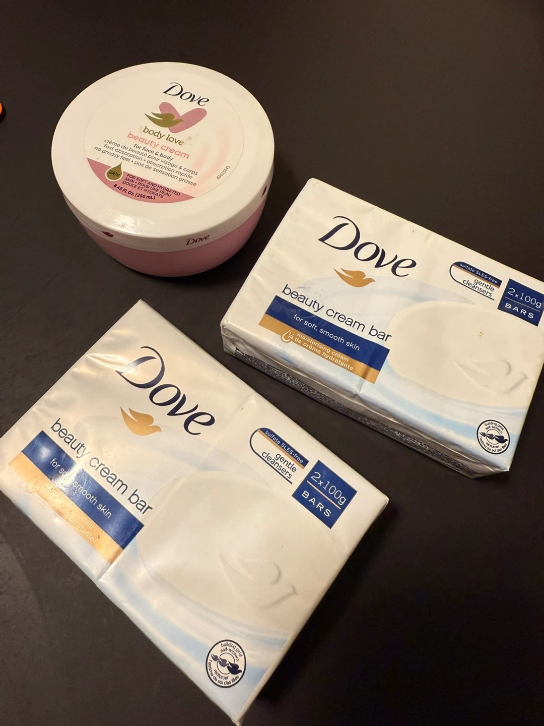 Selling Dove beauty products! Includes a tub of body love beauty cream for face and body (250 ml), and two 100g beauty cream bars for soft, smooth skin! The cream is fast absorbing and hydrating for 24 hours . FYI the cream is open and barely used.