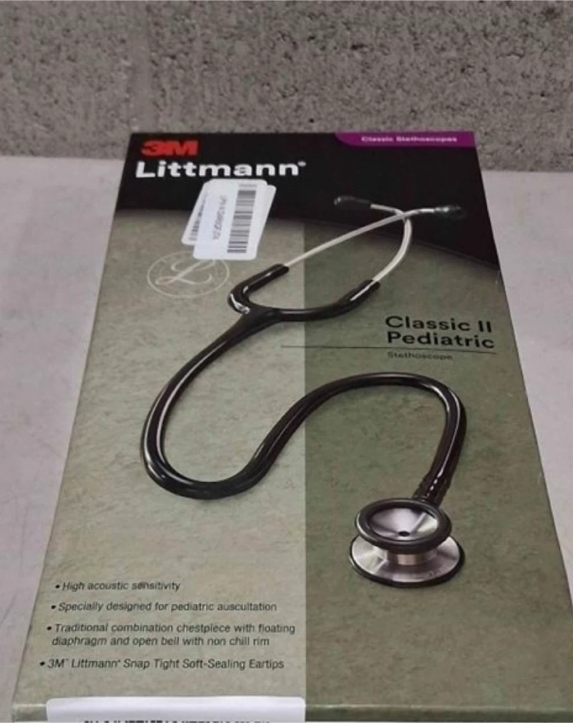 Selling a open box 3M Littmann Classic II Pediatric Stethoscope. It is specially designed for pediatric auscultation with a traditional combination chestpiece featuring a floating diaphragm and open bell with a non-chill rim. It also has high acoustic sensitivity and 3M Littmann snap tight soft-sealing eartips. Comes in the original box!