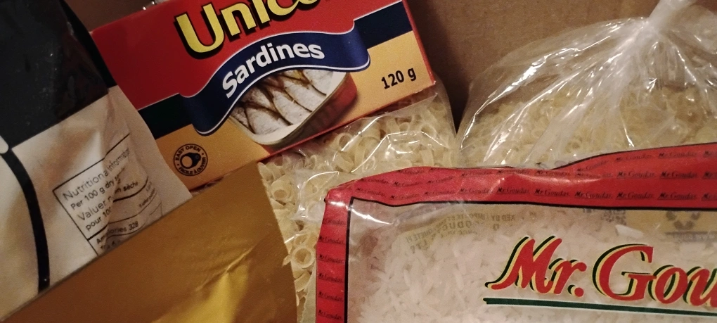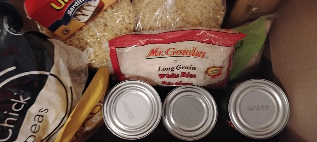 Selling a box filled with assorted food items, including Mr. Gouda's Long Grain White Rice, canned goods, and more! Perfect for stocking up your pantry or sharing with someone in need