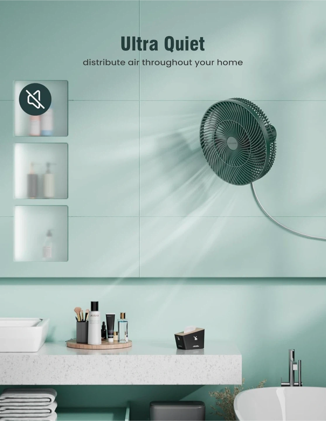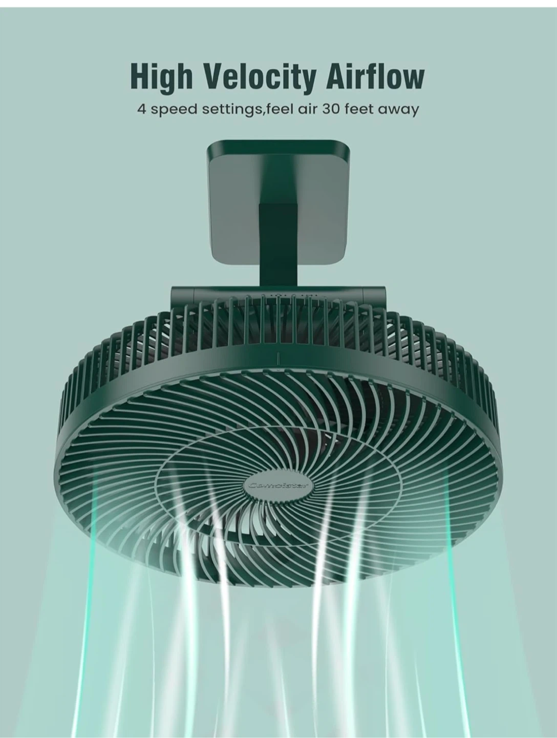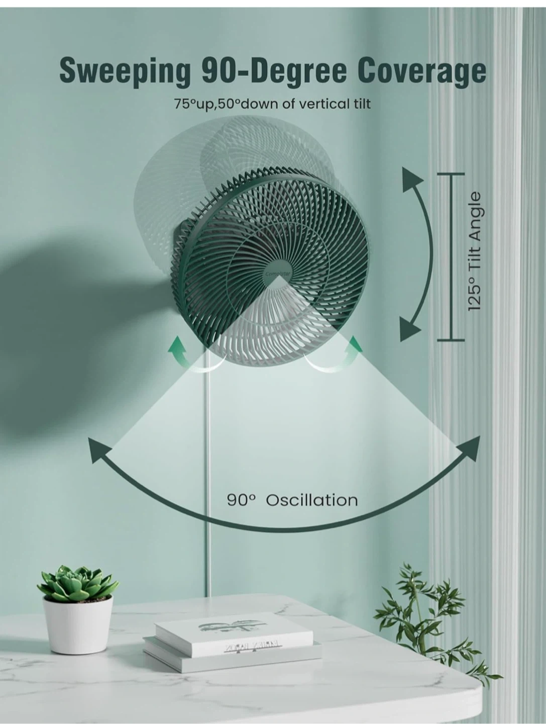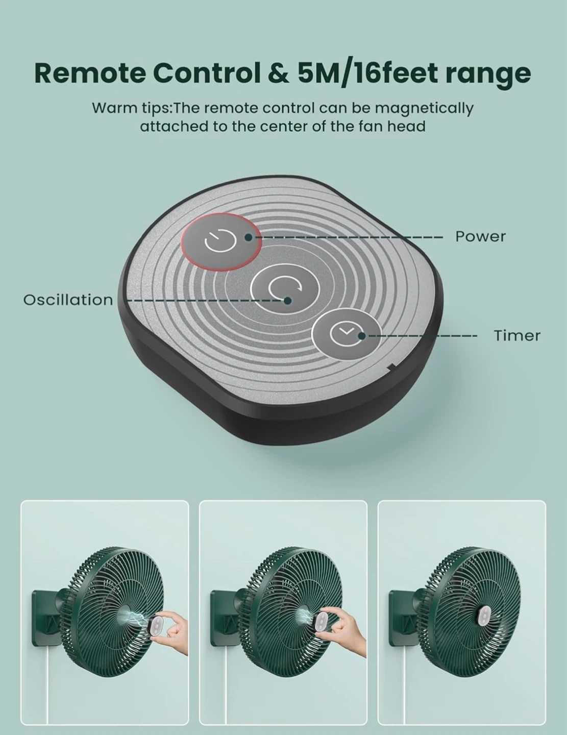 - Remote control with a 5M/16feet range. The remote control can be magnetically attached to the centre of the fan head