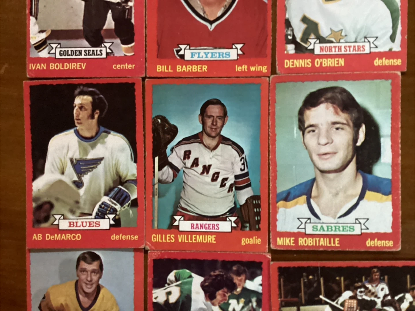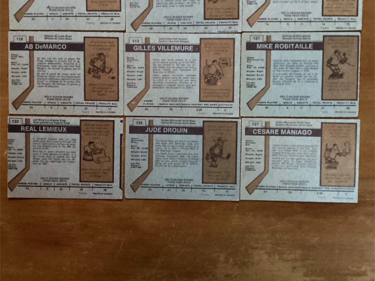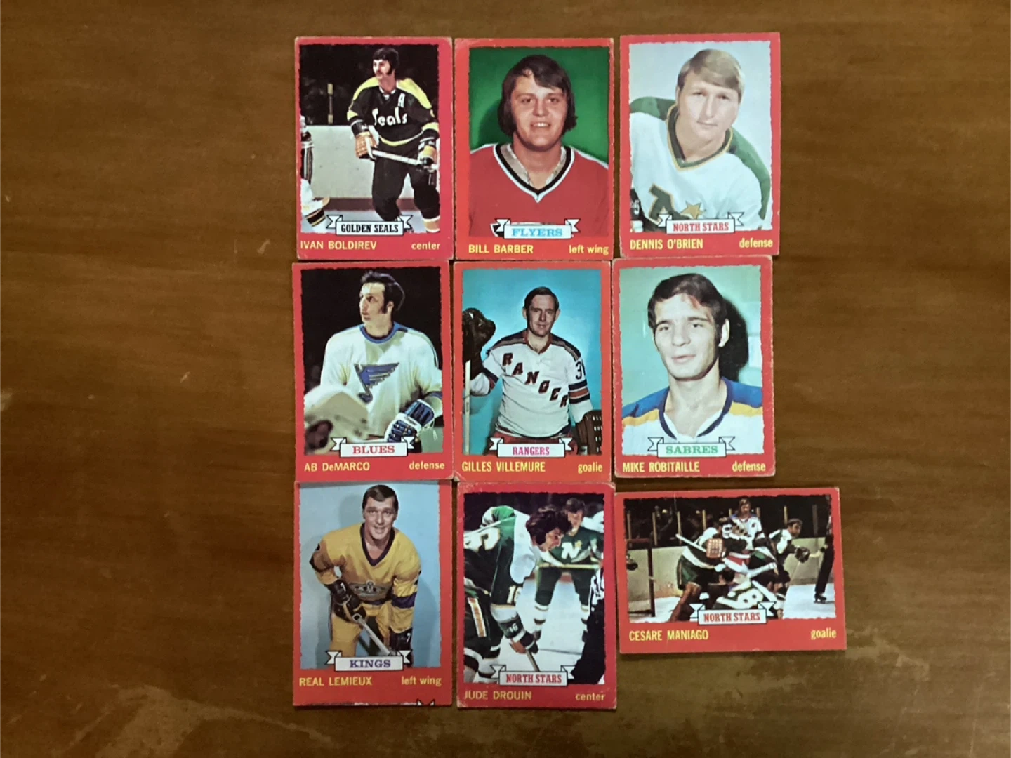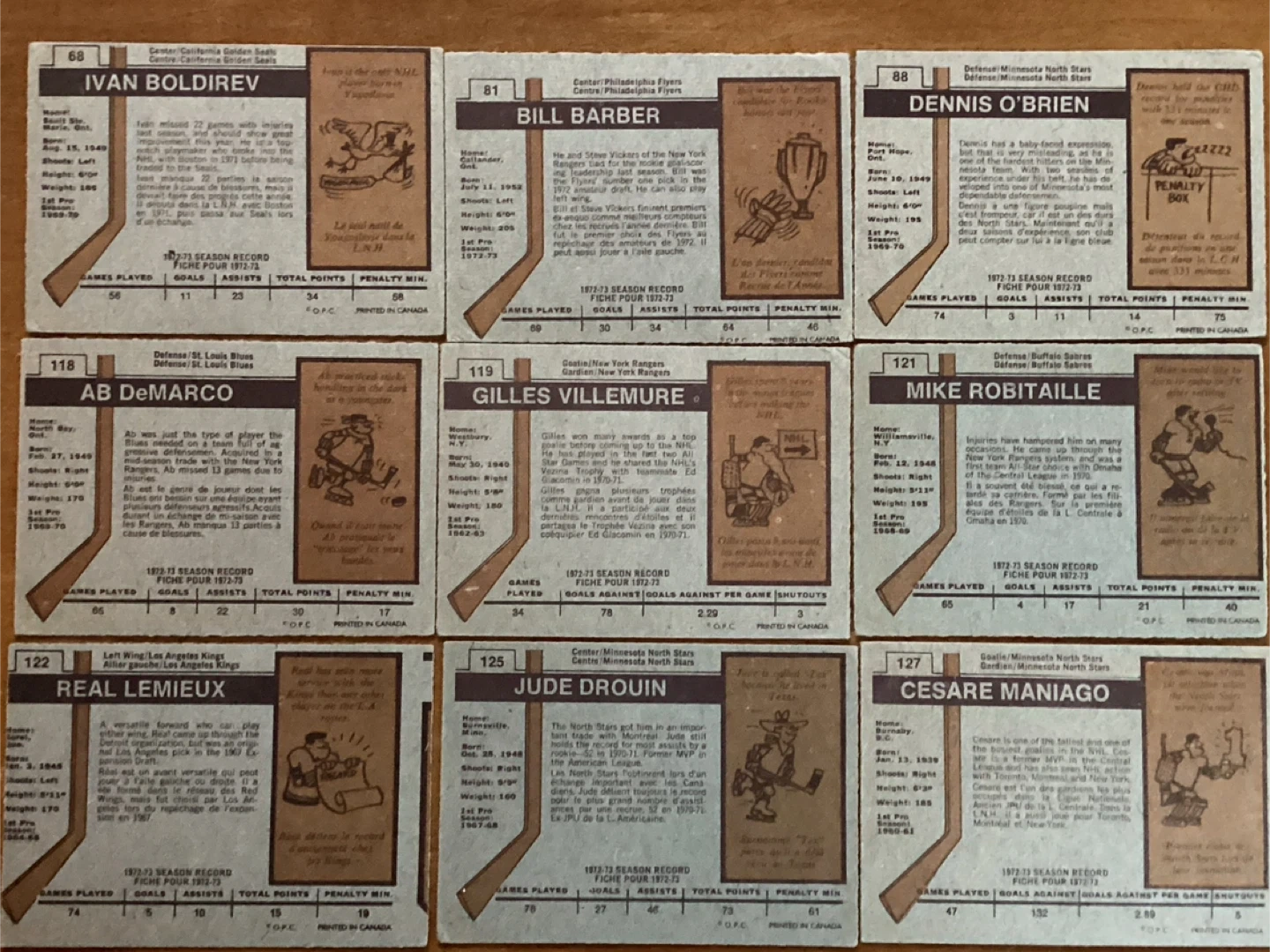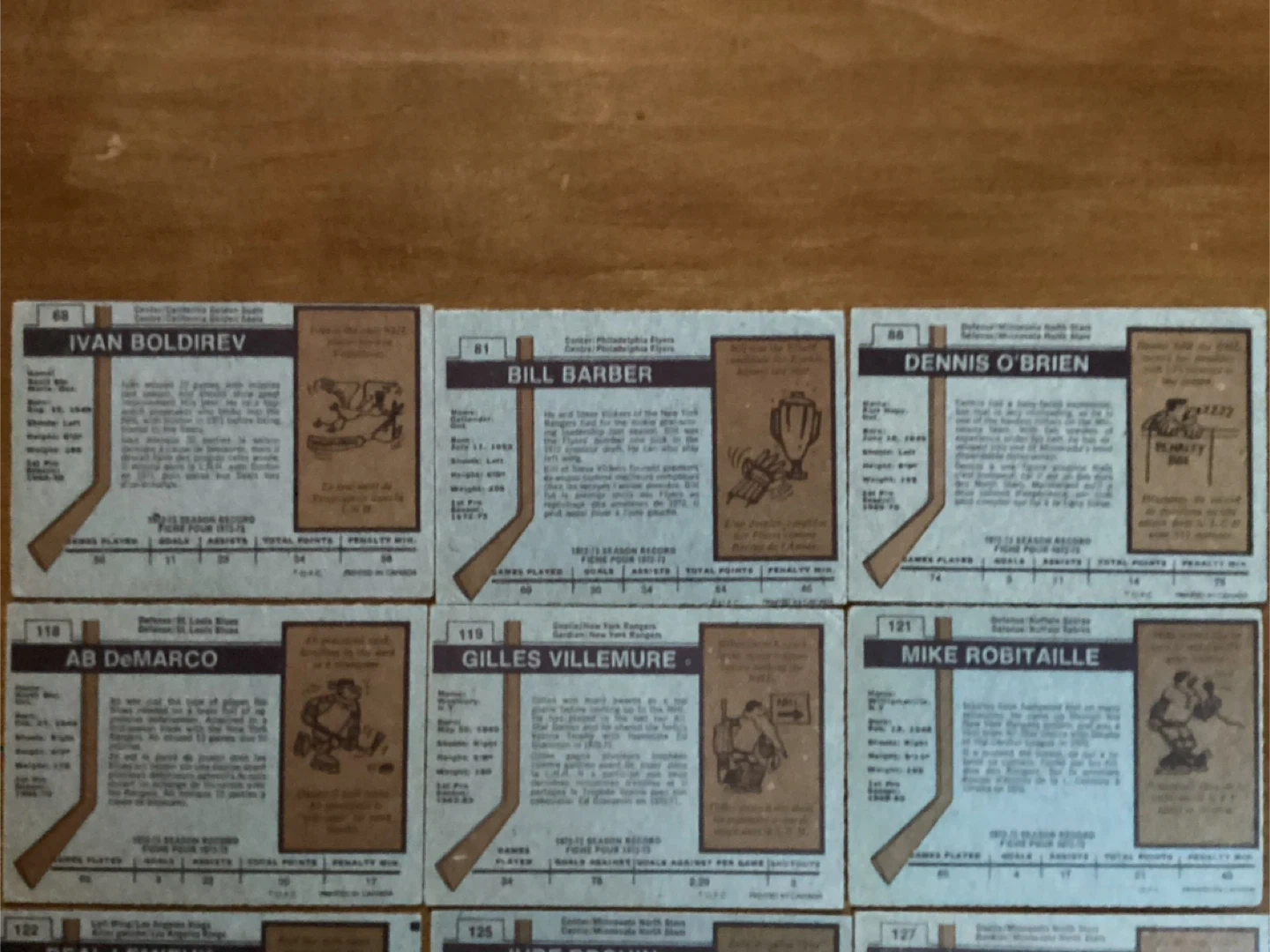 $15.00 for all 9 cards - IVAN BOLDIREV #68, BILL BARBER #81, DENNIS O’BRIEN #88, AB DeMARCO #118, GILLES VILLEMURE #119, MIKE ROBITAILLE #121, REAL LEMIEUX #122, JUDE DROUIN #125, CESARE MANIAGO #127 - Shipping available - Located at Pape Ave & Cosburn ave Toronto - Call Patrick @ 416-930-8338. - Thanks & check out my other posts