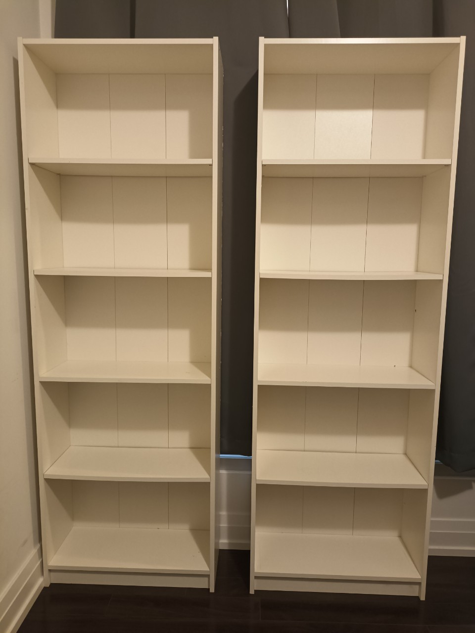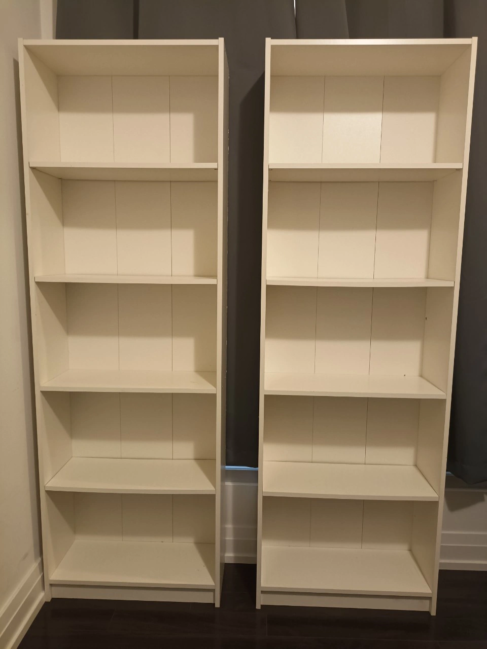 Selling a pair of white bookcases. They're in great shape and ready to organize your books or display your favourite items. Perfect for adding extra storage to any room
